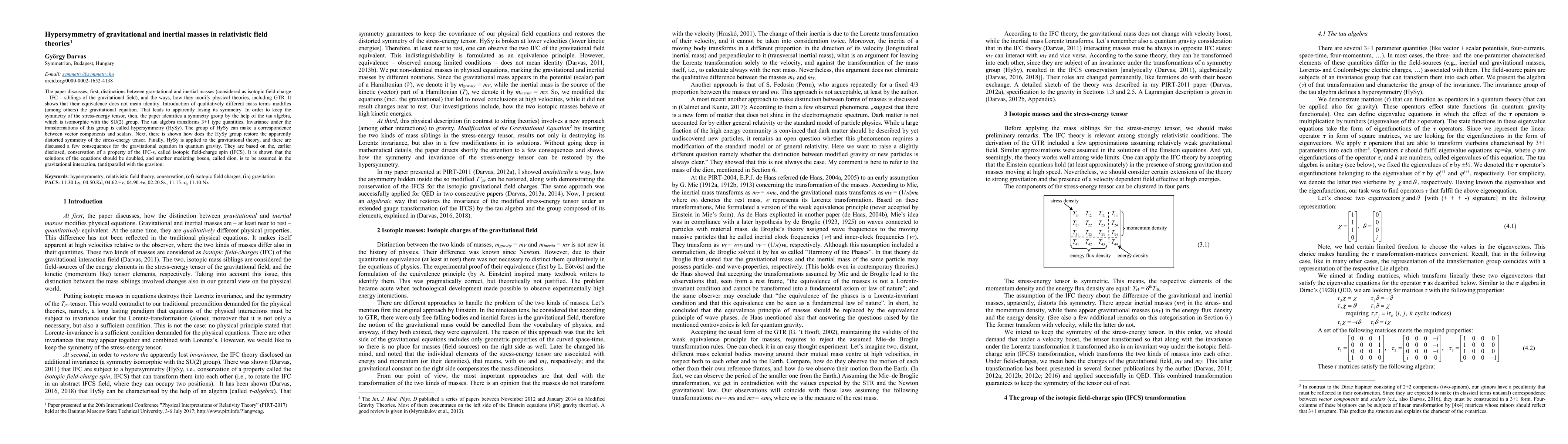 The paper discusses, first, distinctions between gravitational and inertial masses (considered as isotopic field-charge (IFC)siblings of the gravitational field), and the ways, how they modify physical theories, including GTR. It shows that their equivalence does not mean identity. Introduction of qualitatively different mass terms modifies (among others) the gravitational equation. That leads to apparently losing its symmetry. In order to keep the symmetry of the stress-energy tensor, then, the paper identifies a symmetry group by the help of the tau algebra, which is isomorphic with the SU(2) group. The tau algebra transforms 3+1 type quantities. Invariance under the transformations of this group is called hypersymmetry (HySy). The group of HySy can make a correspondence between vector components and scalars. Next, there is shown how does the HySy group restore the apparently distorted symmetry of the stress-energy tensor. Finally, HySy is applied to the gravitational theory, and there are discussed a few consequences for the gravitational equation in quantum gravity. They are based on the, earlier disclosed, conservation of a property of the IFC-s, called isotopic field-charge spin (IFCS). It is shown that the solutions of the equations should be doubled, and another mediating boson, called dion, is to be assumed in the gravitational interaction, (anti)parallel with the graviton.