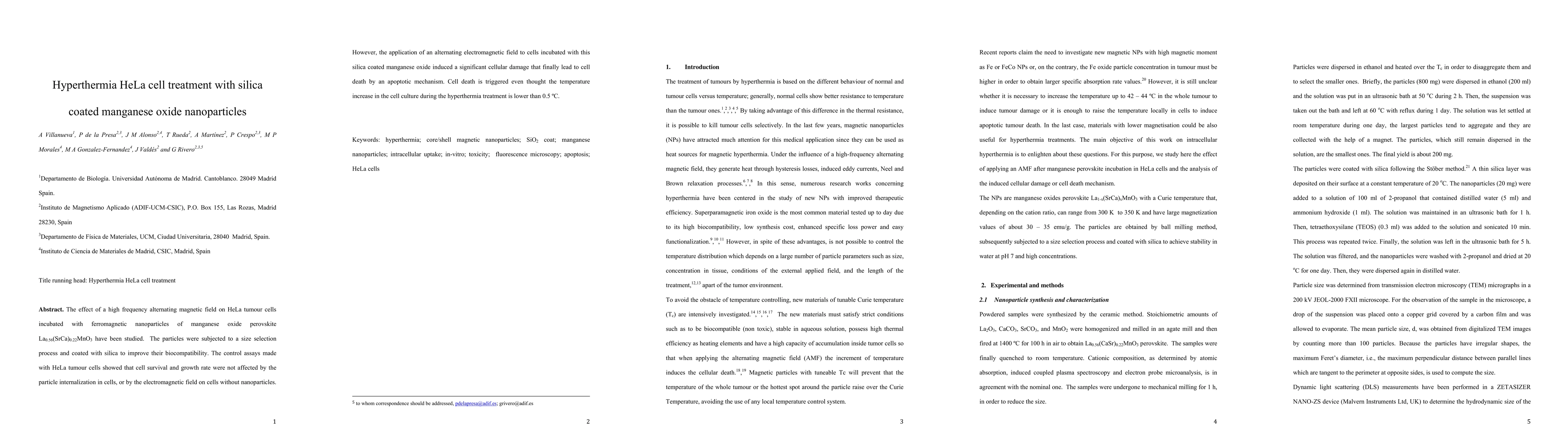 This study investigates the impact of an alternating magnetic field on HeLa tumour cells treated with silica-coated manganese oxide nanoparticles, finding that the combination induces significant cellular damage and apoptosis, despite the temperature rise being minimal. The nanoparticles' biocompatibility and the effectiveness of the magnetic field in causing cell death are highlighted.