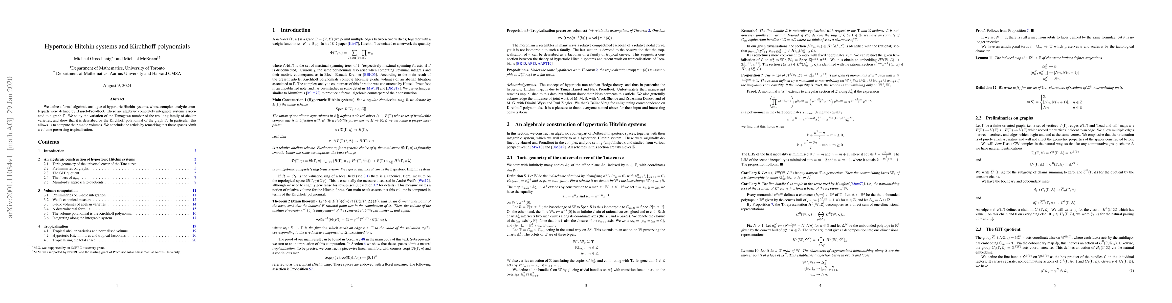 We define a formal algebraic analogue of hypertoric Hitchin systems, whose complex-analytic counterparts were defined by Hausel-Proudfoot. These are algebraic completely integrable systems associated to a graph. We study the variation of the Tamagawa number of the resulting family of abelian varieties, and show that it is described by the Kirchhoff polynomial of the graph. In particular, this allows us to compute their p-adic volumes. We conclude the article by remarking that these spaces admit a volume preserving tropicalisation.