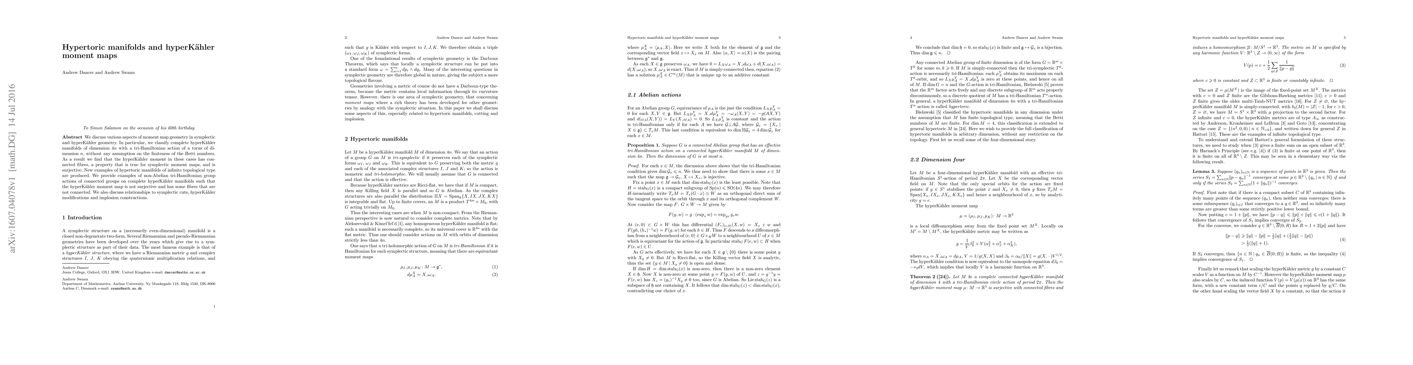 This paper classifies complete hyperKähler manifolds admitting a tri-Hamiltonian action of a torus, finding that their moment maps have connected fibres and are surjective. It also presents new hypertoric manifolds and explores the non-surjectivity of moment maps under non-Abelian group actions.