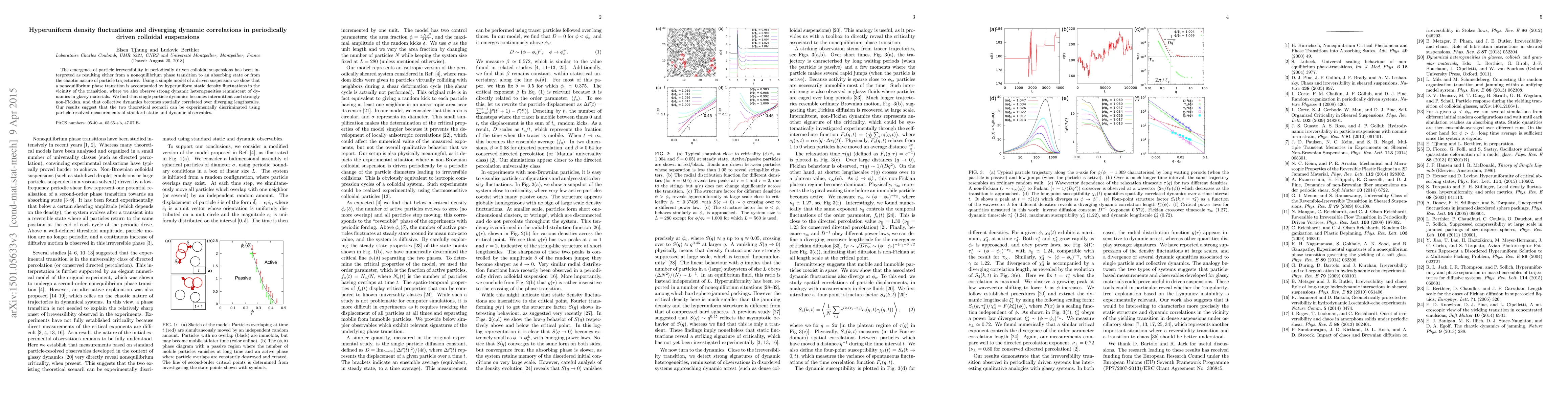 This paper explores the dynamics of periodically driven colloidal suspensions, revealing a nonequilibrium phase transition characterized by hyperuniform density fluctuations and diverging dynamic correlations. The study suggests that these phenomena can be distinguished experimentally through particle-resolved measurements of static and dynamic properties.