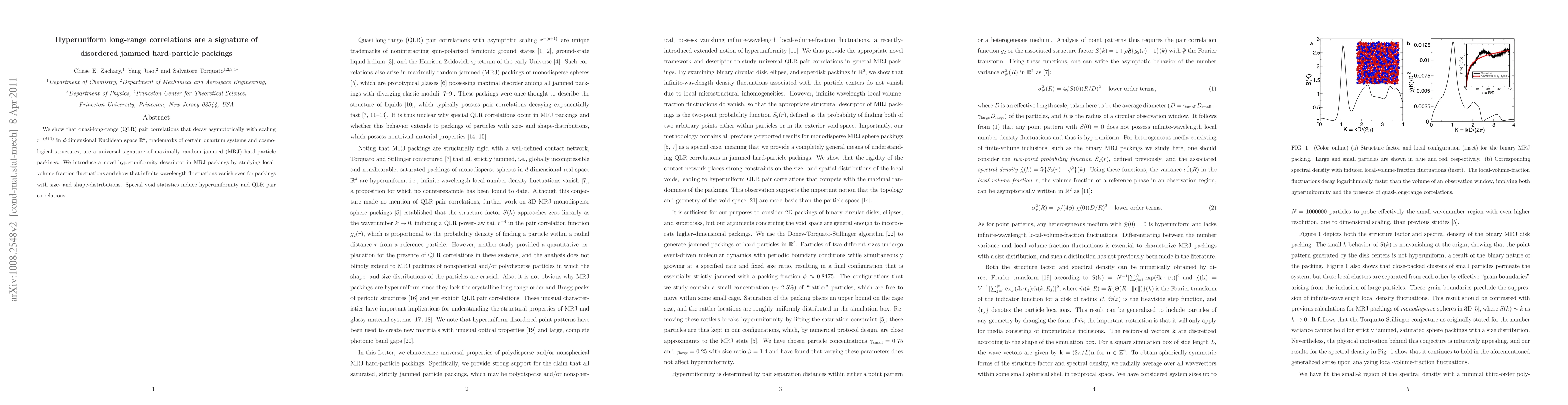 This paper demonstrates that disordered jammed hard-particle packings exhibit quasi-long-range pair correlations, a trait typically seen in quantum systems and cosmological structures. It introduces a hyperuniformity descriptor to show that infinite-wavelength fluctuations vanish in these packings, indicating a universal signature of maximally random jammed states.