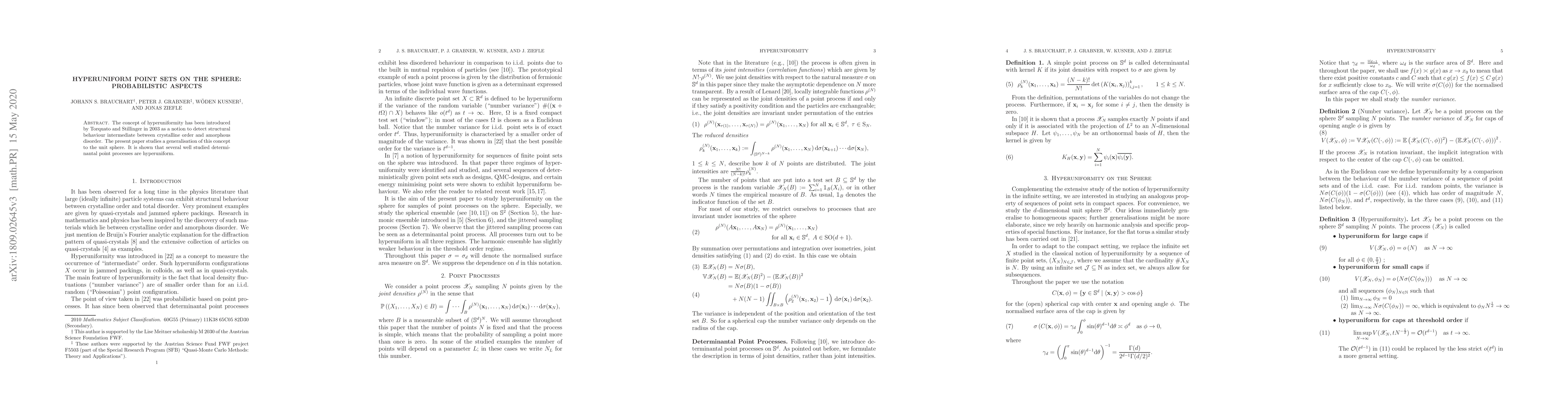 This paper generalizes the notion of hyperuniformity to point sets on the unit sphere, demonstrating that certain determinantal point processes exhibit this property, while the newly introduced projective ensemble does not.