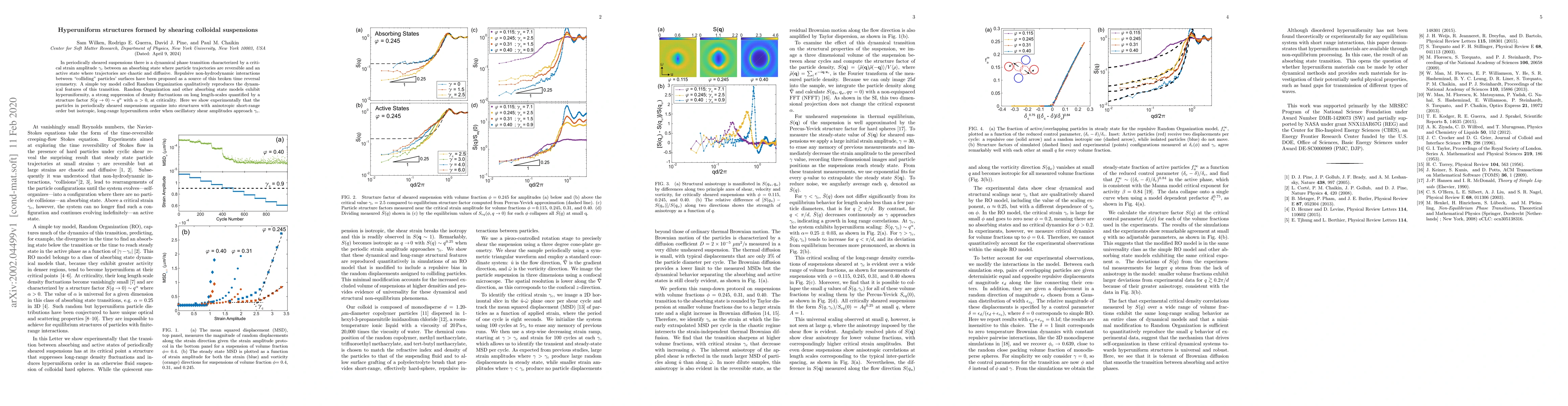 This paper investigates the dynamical phase transition in sheared colloidal suspensions, revealing that particles organize into hyperuniform structures near a critical strain amplitude, characterized by anisotropic short-range order and isotropic long-range order. Experimental results confirm the theoretical prediction of hyperuniformity at the transition point.