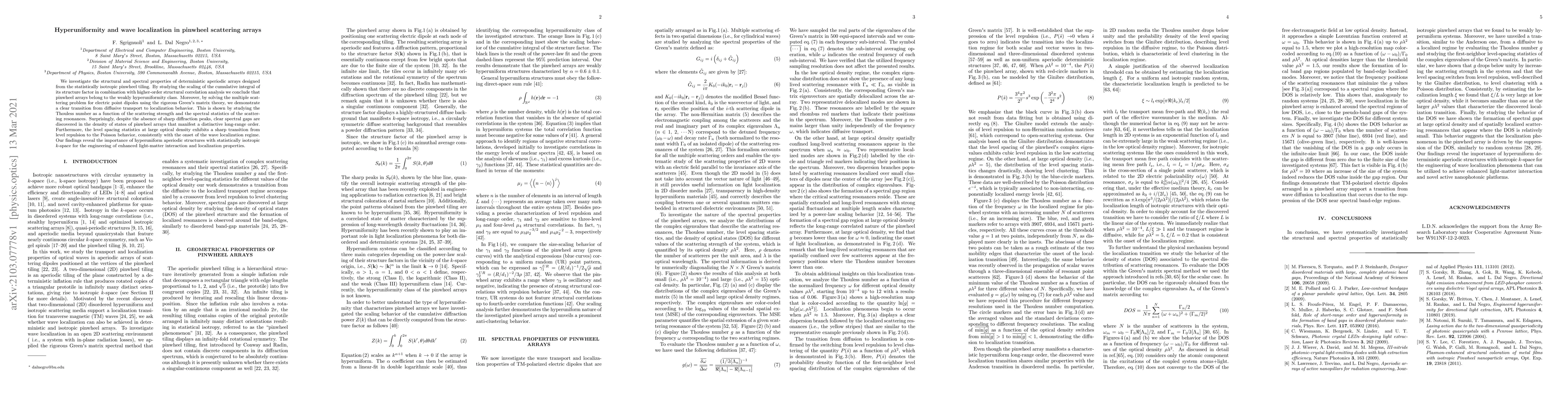 This paper explores the structural and spectral properties of pinwheel tiling arrays, finding they exhibit weak hyperuniformity and transition from diffusive to localized wave transport. It reveals spectral gaps and a transition in level spacing statistics, highlighting the potential of such structures for advanced light-matter interaction.