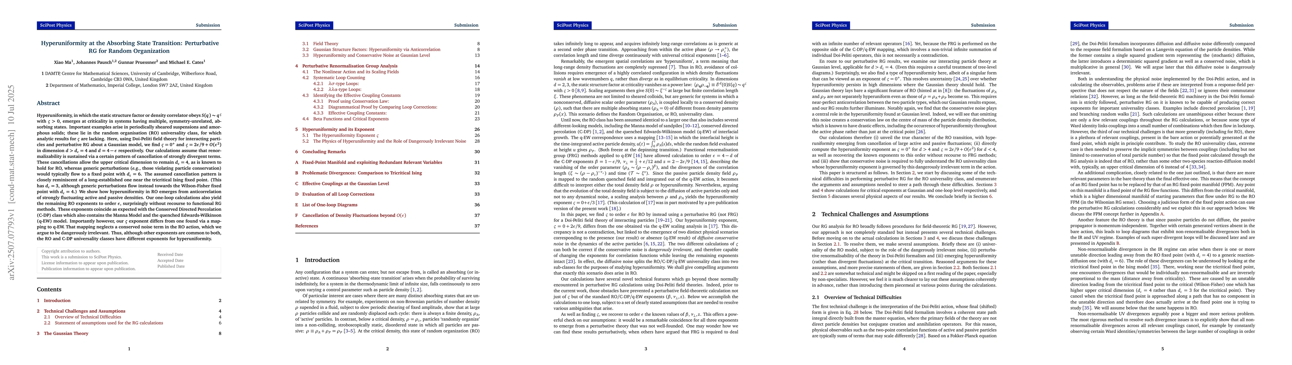 The research employs Doi-Peliti field theory and perturbative RG about a Gaussian model to analyze hyperuniformity at the absorbing state transition in systems with random organization (RO).