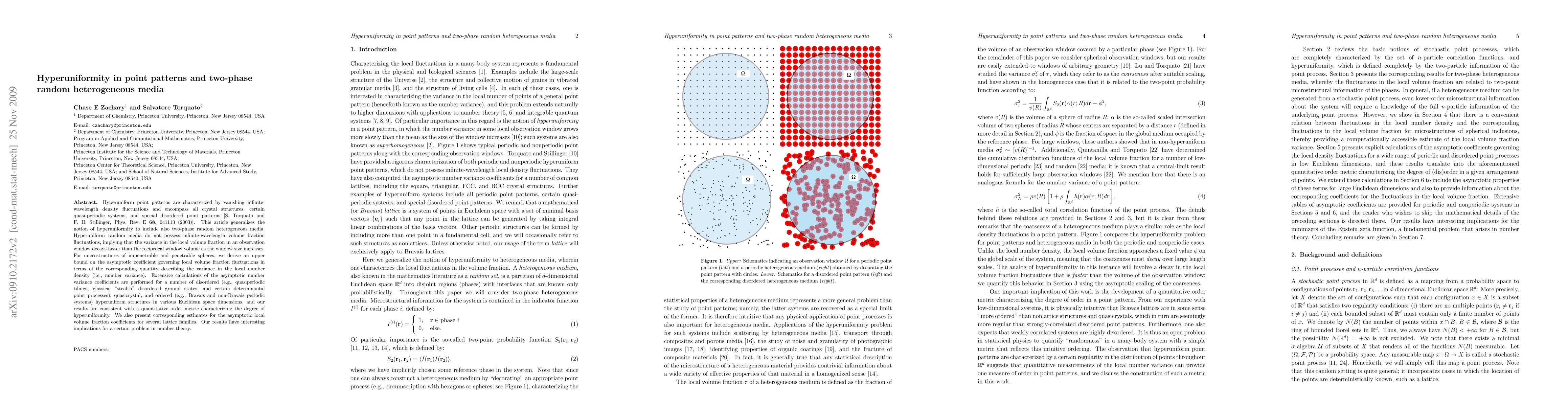 Hyperuniform point patterns are characterized by vanishing infinite wavelength density fluctuations and encompass all crystal structures, certain quasi-periodic systems, and special disordered point patterns. This article generalizes the notion of hyperuniformity to include also two-phase random heterogeneous media. Hyperuniform random media do not possess infinite-wavelength volume fraction fluctuations, implying that the variance in the local volume fraction in an observation window decays faster than the reciprocal window volume as the window size increases. For microstructures of impenetrable and penetrable spheres, we derive an upper bound on the asymptotic coefficient governing local volume fraction fluctuations in terms of the corresponding quantity describing the variance in the local number density (i.e., number variance). Extensive calculations of the asymptotic number variance coefficients are performed for a number of disordered (e.g., quasiperiodic tilings, classical stealth disordered ground states, and certain determinantal point processes), quasicrystal, and ordered (e.g., Bravais and non-Bravais periodic systems) hyperuniform structures in various Euclidean space dimensions, and our results are consistent with a quantitative order metric characterizing the degree of hyperuniformity. We also present corresponding estimates for the asymptotic local volume fraction coefficients for several lattice families. Our results have interesting implications for a certain problem in number theory.
