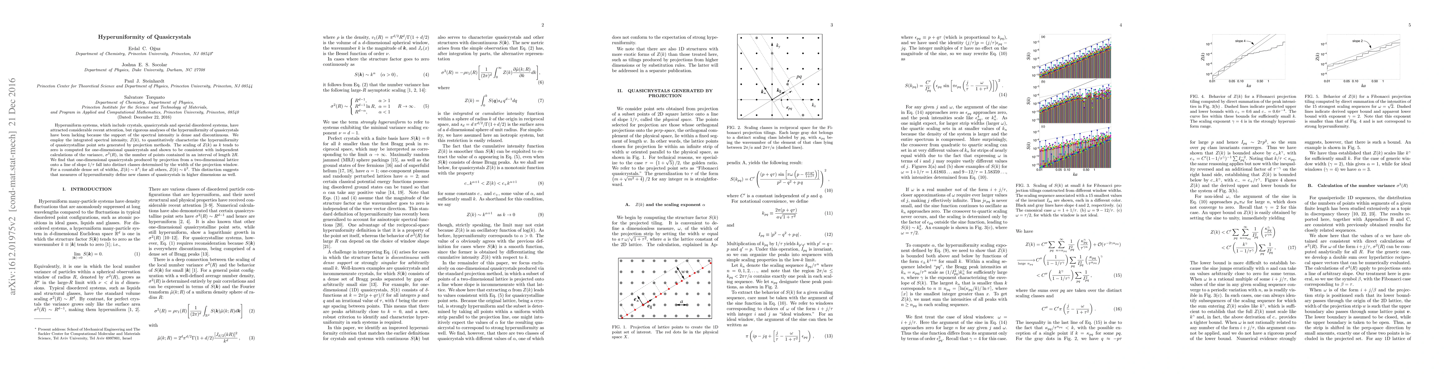 This paper quantitatively analyzes the hyperuniformity of one-dimensional quasicrystals using integrated spectral intensity, finding that quasicrystals fall into distinct classes based on the width of the projection window. The scaling behavior of $Z(k)$ as $k$ approaches zero indicates a $k^4$ or $k^2$ dependence, suggesting new classes of quasicrystals in higher dimensions.