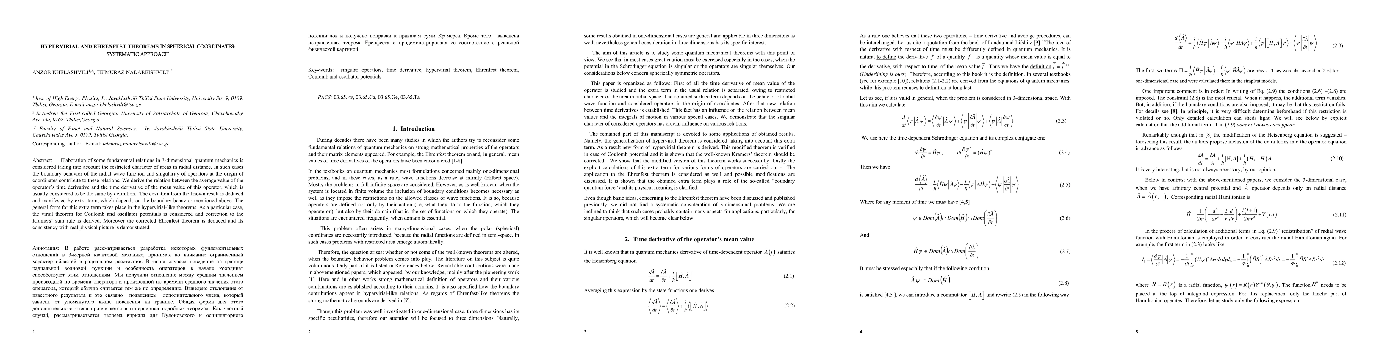 This paper systematically derives hypervirial and Ehrenfest theorems in spherical coordinates, highlighting the impact of boundary behavior of the radial wave function and singularities at the origin. It reveals an additional term in the average operator time derivative, correcting known results for Coulomb and oscillator potentials, and demonstrates the consistency of the corrected Ehrenfest theorem with physical reality.