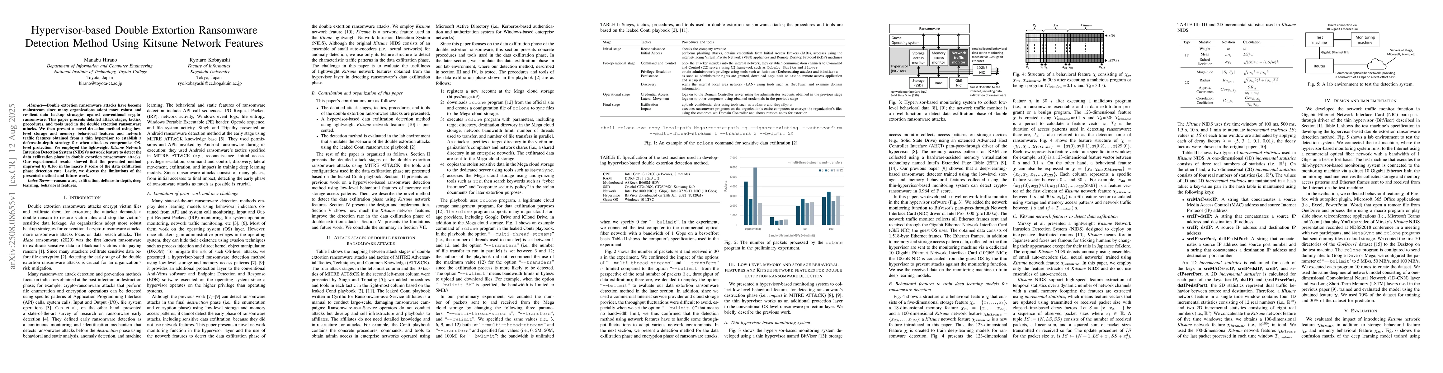 Double extortion ransomware attacks have become mainstream since many organizations adopt more robust and resilient data backup strategies against conventional crypto-ransomware. This paper presents detailed attack stages, tactics, procedures, and tools used in the double extortion ransomware attacks. We then present a novel detection method using low-level storage and memory behavioral features and network traffic features obtained from a thin hypervisor to establish a defense-in-depth strategy for when attackers compromise OS-level protection. We employed the lightweight \emph{Kitsune} Network Intrusion Detection System (NIDS)'s network feature to detect the data exfiltration phase in double extortion ransomware attacks. Our experimental results showed that the presented method improved by 0.166 in the macro F score of the data exfiltration phase detection rate. Lastly, we discuss the limitations of the presented method and future work.