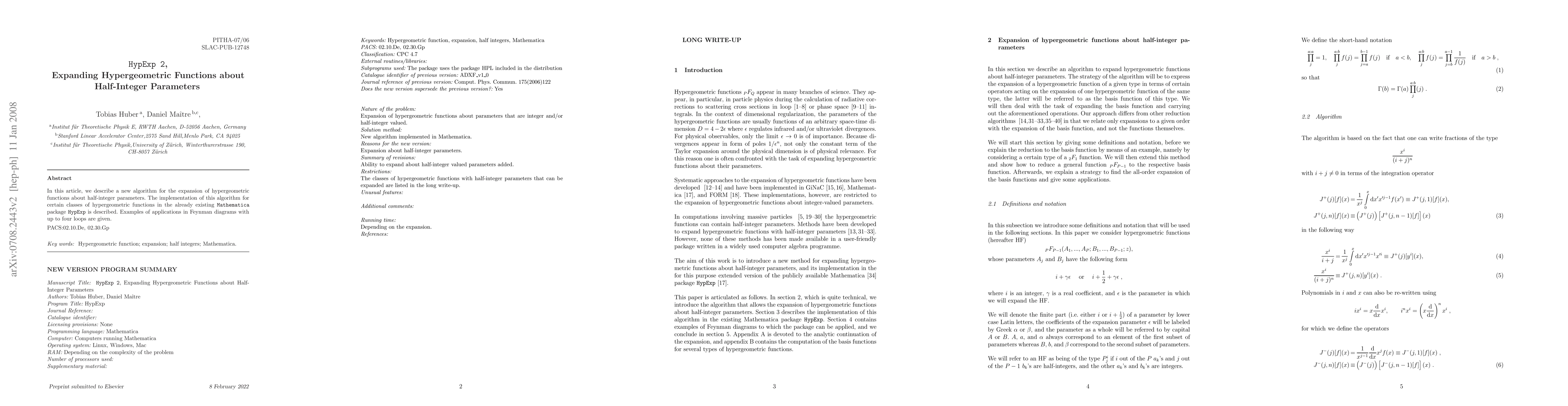In this article, we describe a new algorithm for the expansion of hypergeometric functions about half-integer parameters. The implementation of this algorithm for certain classes of hypergeometric functions in the already existing Mathematica package HypExp is described. Examples of applications in Feynman diagrams with up to four loops are given.