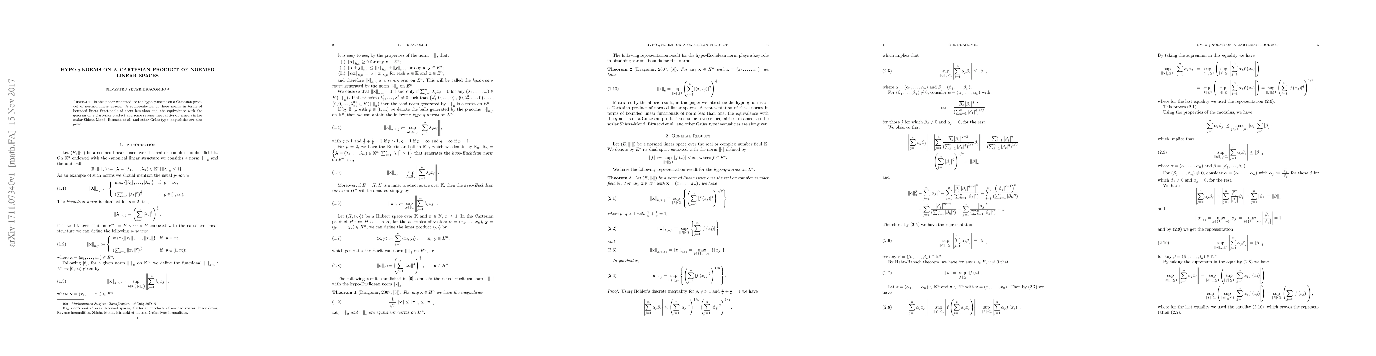 In this paper we introduce the hypo-q-norms on a Cartesian product of normed linear spaces. A representation of these norms in terms of bounded linear functionals of norm less than one, the equivalence with the q-norms on a Cartesian product and some reverse inequalities obtained via the scalar Shisha-Mond, Birnacki et al. and other Gruss type inequalities are also given.