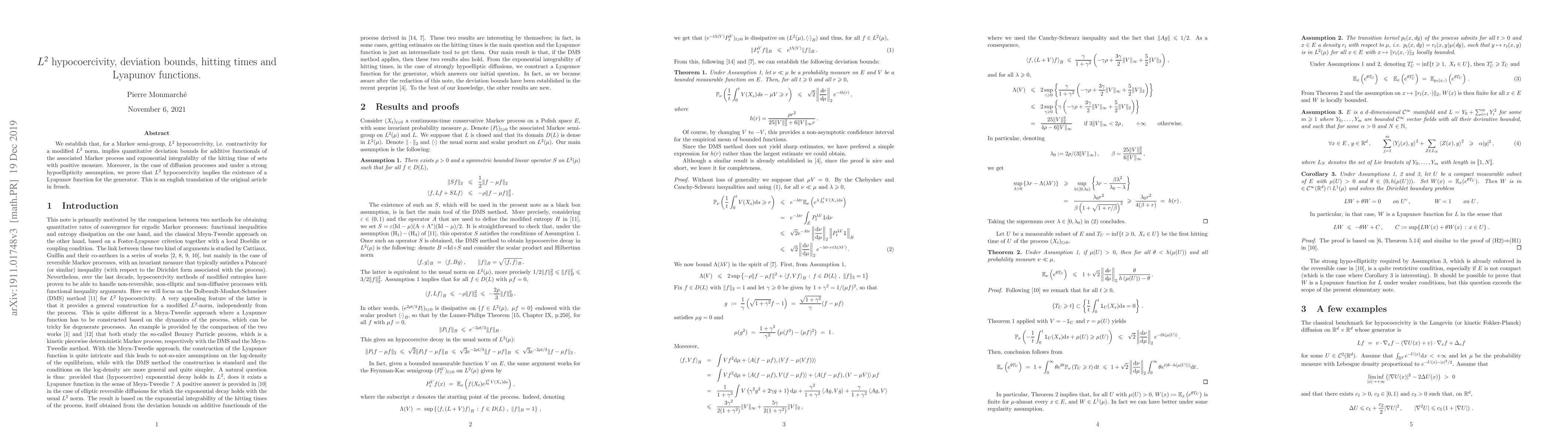 We establish that, for a Markov semi-group, $L^2$ hypocoercivity, i.e. contractivity for a modified $L^2$ norm, implies quantitative deviation bounds for additive functionals of the associated Markov process and exponential integrability of the hitting time of sets with positive measure. Moreover, in the case of diffusion processes and under a strong hypoellipticity assumption, we prove that $L^2$ hypocoercivity implies the existence of a Lyapunov function for the generator. An english translation of the original article in french is provided. ----- On montre que, pour un semi-groupe de Markov, l'hypocoercivit\'e $L^2$ -- c'est-\`a-dire la contractivit\'e d'une norme $L^2$ modifi\'ee -- implique des in\'egalit\'es de concentration quantitatives et l'int\'egrabilit\'e exponentielle des temps d'atteinte des ensembles de mesure positive. D'autre part, pour les diffusions et sous une hypoth\`ese forte d'hypoellipticit\'e, on \'etablit que l'hypocoercivit\'e $L^2$ implique l'existence d'une fonction de Lyapunov pour le g\'en\'erateur associ\'e. Une traduction en anglais est disponible.