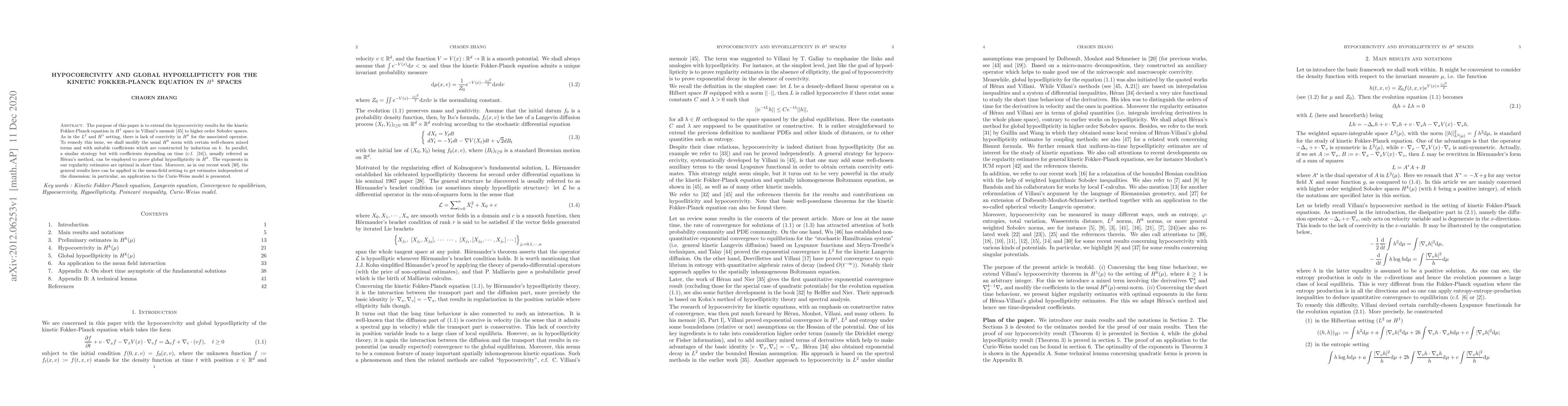 This paper extends hypocoercivity results for the kinetic Fokker-Planck equation to higher order Sobolev spaces $H^k$ by modifying the $H^k$ norm with mixed terms. It also proves global hypoellipticity using Héraux's method, achieving optimal regularity estimates in short time and applying the results to the mean-field setting, including the Curie-Weiss model.