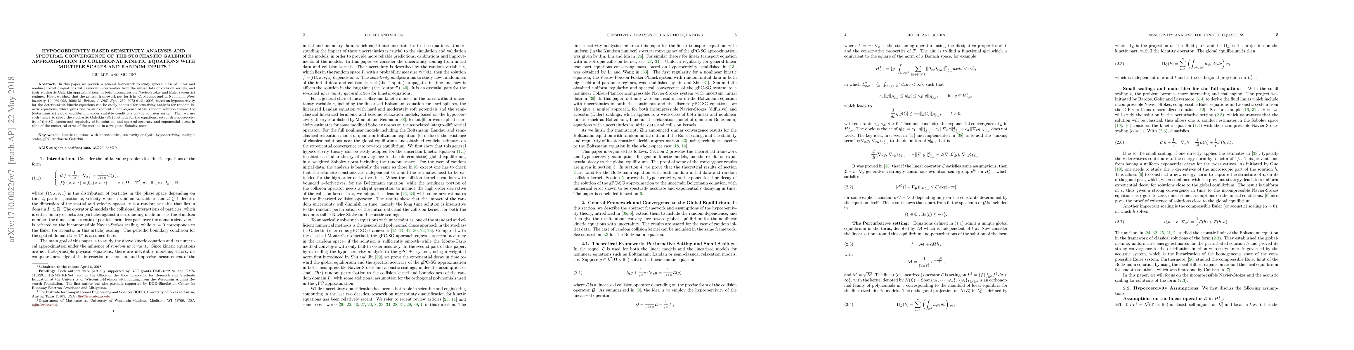 This paper develops a hypocoercivity-based framework for sensitivity analysis of stochastic kinetic equations with random inputs, showing exponential convergence to equilibrium. It also establishes the hypocoercivity, regularity, and spectral accuracy of stochastic Galerkin approximations for these equations.