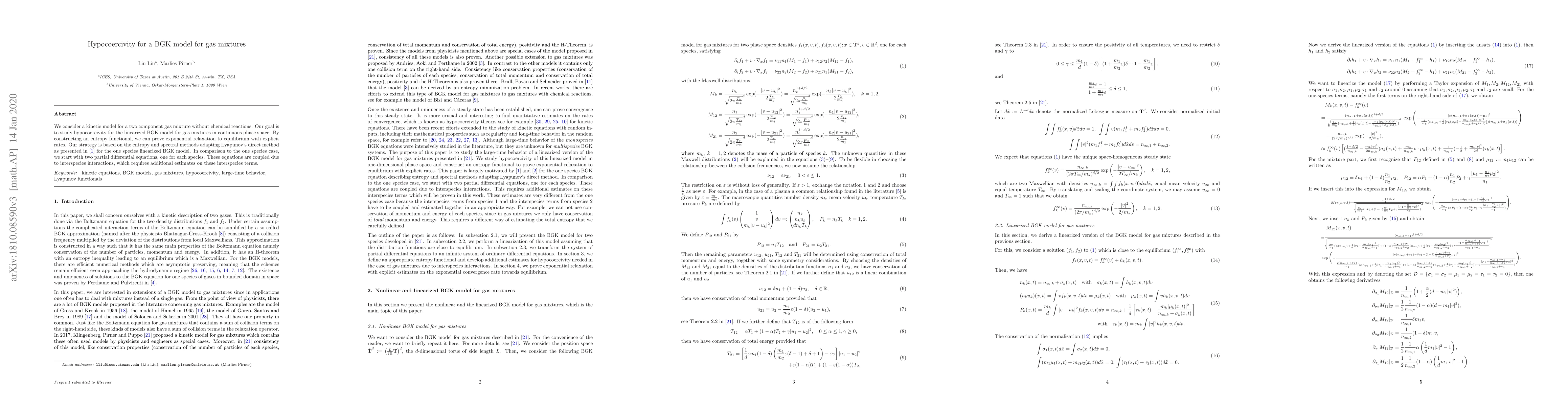 This paper investigates hypocoercivity for a linearized BGK model in a two-component gas mixture, proving exponential relaxation to equilibrium using entropy and spectral methods. The study extends previous results for one species to account for interspecies interactions, requiring additional estimates on coupled partial differential equations.