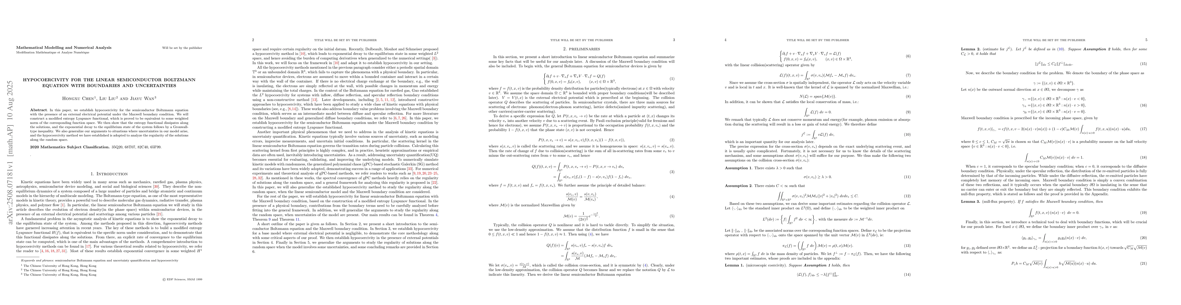 In this paper, we establish hypocoercivity for the semiconductor Boltzmann equation with the presence of an external electrical potential under the Maxwell boundary condition. We will construct a modified entropy Lyapunov functional, which is proved to be equivalent to some weighted norm of the corresponding function space. We then show that the entropy functional dissipates along the solutions, and the exponential decay to the equilibrium state of the system follows by a Gronwall type inequality. We also generalize our arguments to situations where uncertainties in our model arise,and the hypocoercivity method we have established is adopted to analyze the regularity of the solutions along the random space.