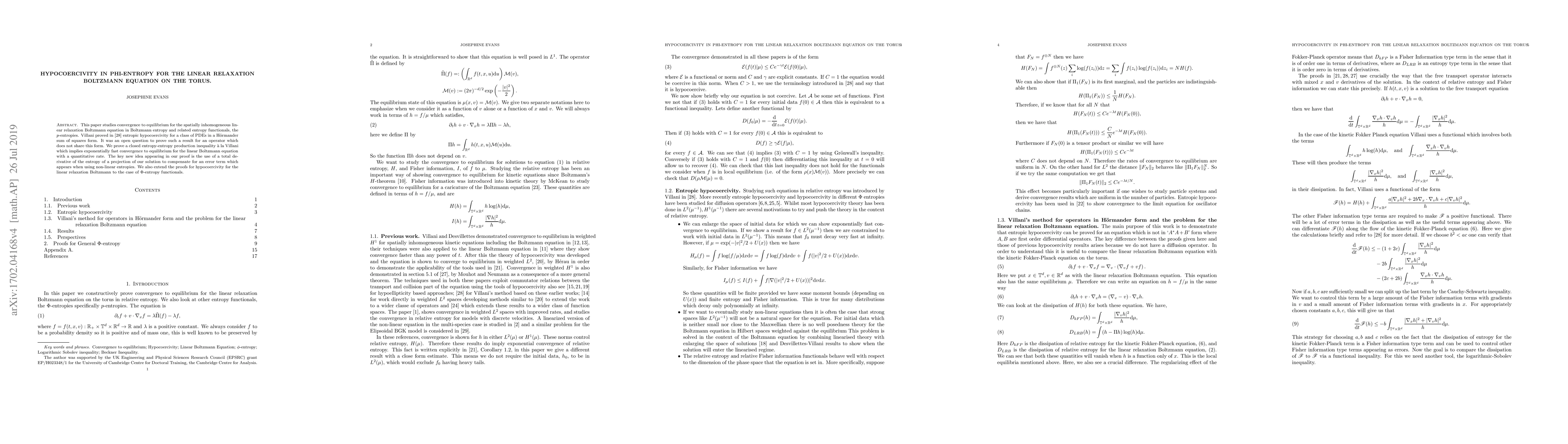 This paper studies convergence to equilibrium for the spatially inhomogeneous linear relaxation Boltzmann equation in Boltzmann entropy and related entropy functionals the $p$-entropies. Villani proved in \cite{V09} entropic hypocoercivity for a class of PDEs in a H\"{o}rmander sum of squares form. It was an open question to prove such a result for an operator which does not share this form. We show exponentially fast convergence to equilibrium with explicit rate in entropy for a linear relaxation Boltzmann equation. The key new idea appearing in our proof is the use of a total derivative of the entropy of a projection of our solution to compensate for additional error term which appear when using non-linear entropies. We also extend the proofs for hypocoercivity of both the linear relaxation Boltzmann and kinetic Fokker-Planck to the case of $p$-entropy functionals.