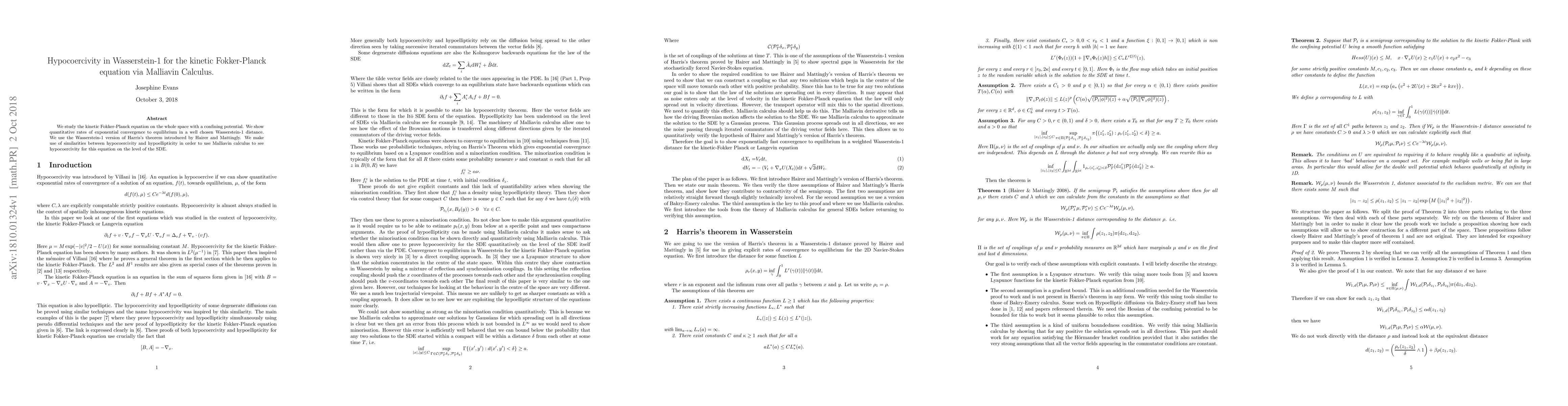 This paper investigates the kinetic Fokker-Planck equation with a confining potential, demonstrating exponential convergence to equilibrium in Wasserstein-1 distance. It leverages the Wasserstein-1 version of Harris's theorem and employs Malliavin calculus to establish hypocoercivity, linking it to hypoellipticity on the SDE level.