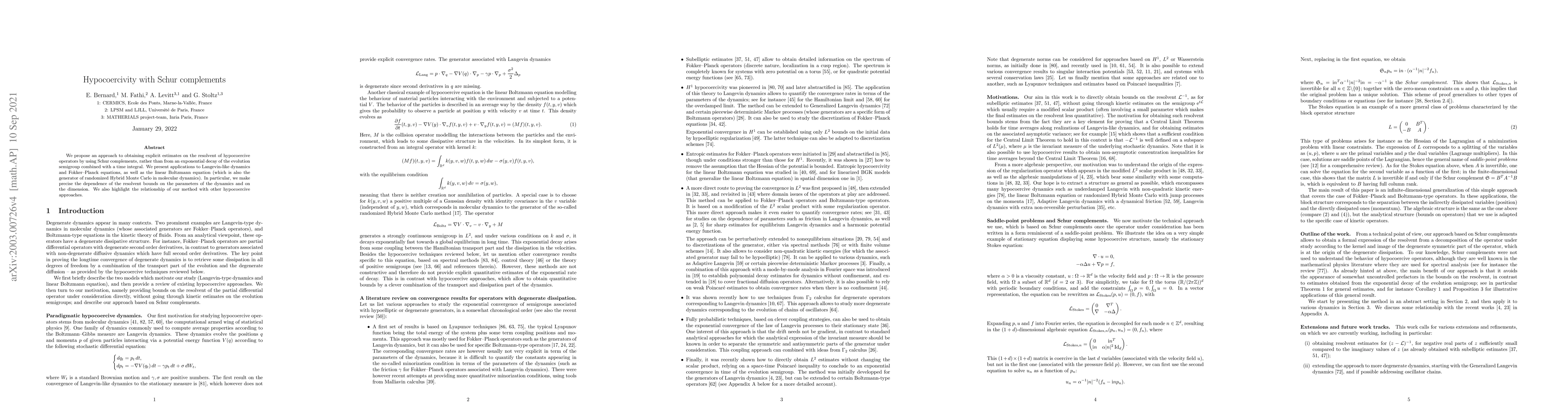 We propose an approach to obtaining explicit estimates on the resolvent of hypocoercive operators by using Schur complements, rather than from an exponential decay of the evolution semigroup combined with a time integral. We present applications to Langevin-like dynamics and Fokker--Planck equations, as well as the linear Boltzmann equation (which is also the generator of randomized Hybrid Monte Carlo in molecular dynamics). In particular, we make precise the dependence of the resolvent bounds on the parameters of the dynamics and on the dimension. We also highlight the relationship of our method with other hypocoercive approaches.