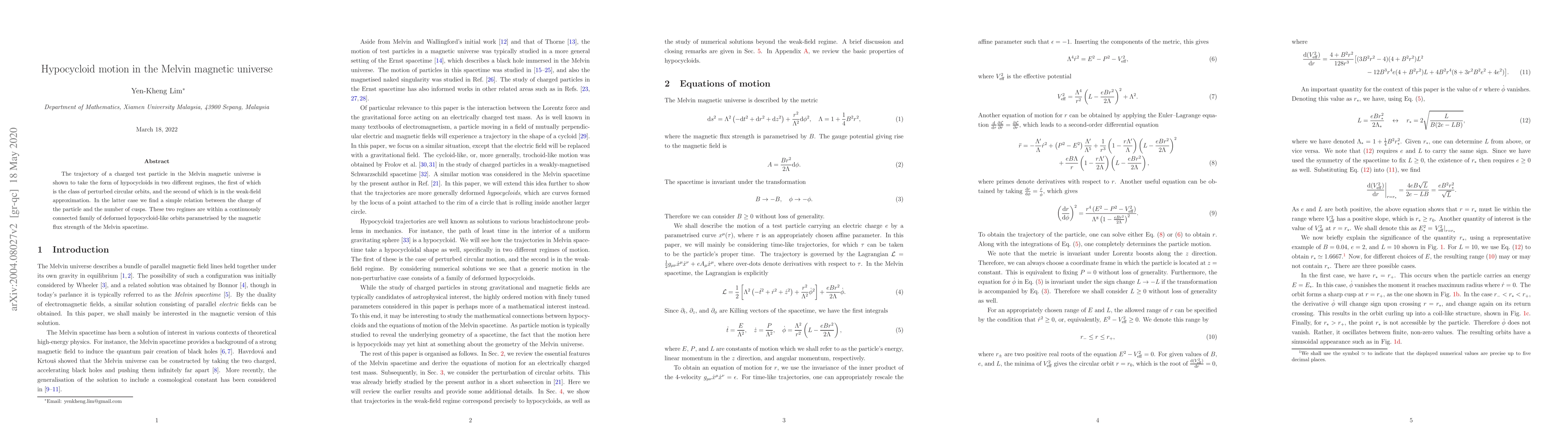 The research demonstrates that a charged test particle in the Melvin magnetic universe follows hypocycloid trajectories in two regimes: perturbed circular orbits and weak-field approximation, with a direct relation between particle charge and cusp number. These regimes form a connected family of orbits parameterized by magnetic flux strength.