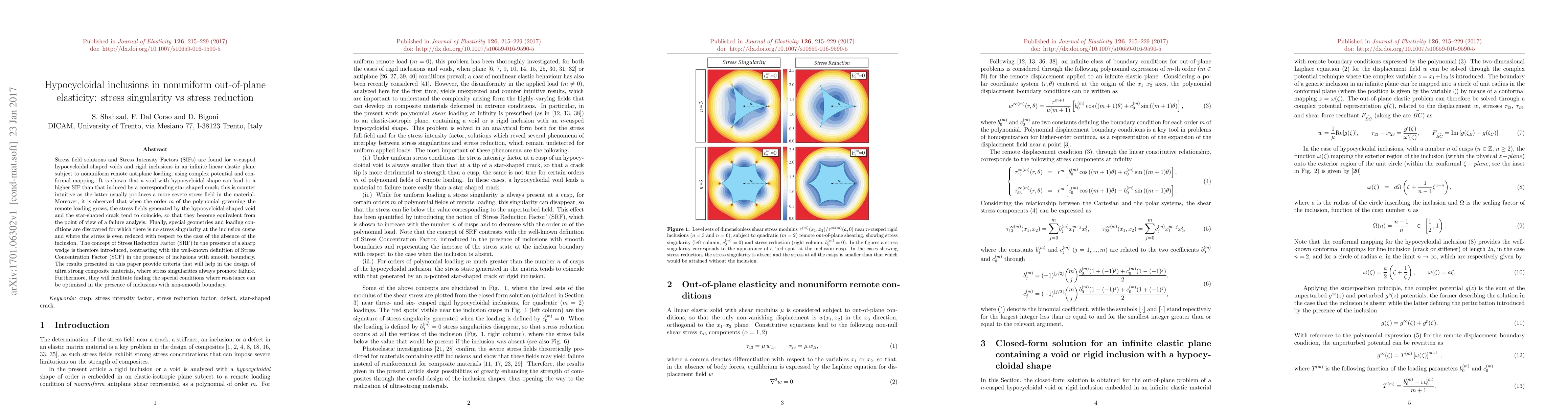 Stress field solutions and Stress Intensity Factors (SIFs) are found for $n$-cusped hypocycloidal shaped voids and rigid inclusions in an infinite linear elastic plane subject to nonuniform remote antiplane loading, using complex potential and conformal mapping. It is shown that a void with hypocycloidal shape can lead to a higher SIF than that induced by a corresponding star-shaped crack; this is counter intuitive as the latter usually produces a more severe stress field in the material. Moreover, it is observed that when the order $m$ of the polynomial governing the remote loading grows, the stress fields generated by the hypocycloidal-shaped void and the star-shaped crack tend to coincide, so that they become equivalent from the point of view of a failure analysis. Finally, special geometries and loading conditions are discovered for which there is no stress singularity at the inclusion cusps and where the stress is even reduced with respect to the case of the absence of the inclusion. The concept of Stress Reduction Factor (SRF) in the presence of a sharp wedge is therefore introduced, contrasting with the well-known definition of Stress Concentration Factor (SCF) in the presence of inclusions with smooth boundary. The results presented in this paper provide criteria that will help in the design of ultra strong composite materials, where stress singularities always promote failure. Furthermore, they will facilitate finding the special conditions where resistance can be optimized in the presence of inclusions with non-smooth boundary.