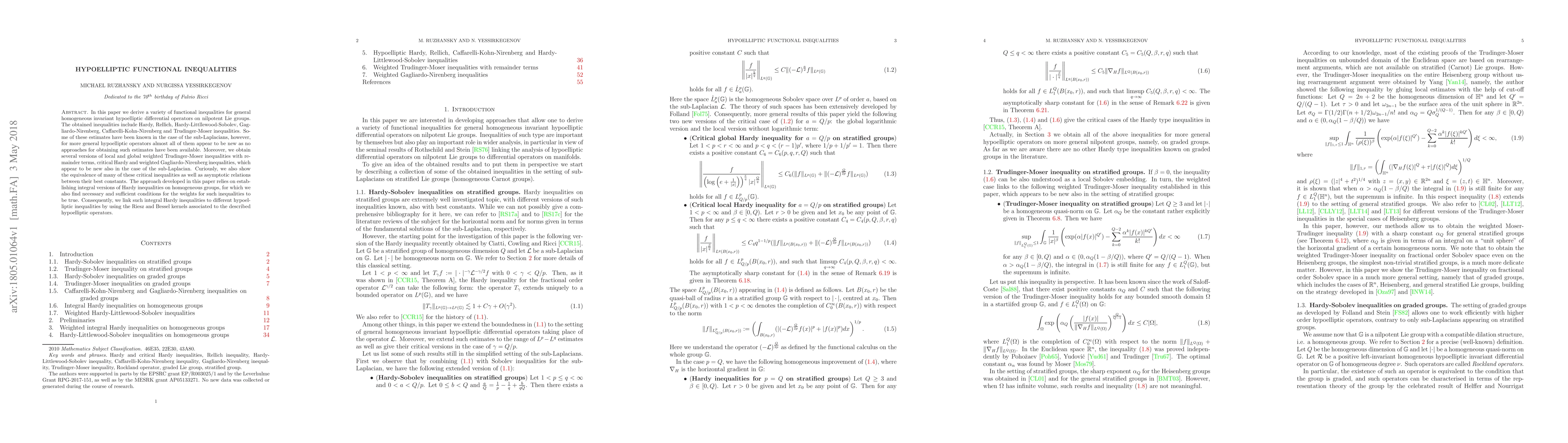 In this paper we derive a variety of functional inequalities for general homogeneous invariant hypoelliptic differential operators on nilpotent Lie groups. The obtained inequalities include Hardy, Rellich, Hardy-Littllewood-Sobolev, Galiardo-Nirenberg, Caffarelli-Kohn-Nirenberg and Trudinger-Moser inequalities. Some of these estimates have been known in the case of the sub-Laplacians, however, for more general hypoelliptic operators almost all of them appear to be new as no approaches for obtaining such estimates have been available. Moreover, we obtain several versions of local and global weighted Trudinger-Moser inequalities with remainder terms, critical Hardy and weighted Gagliardo-Nirenberg inequalities, which appear to be new also in the case of the sub-Laplacian. Curiously, we also show the equivalence of many of these critical inequalities as well as asymptotic relations between their best constants. The approach developed in this paper relies on establishing integral versions of Hardy inequalities on homogeneous groups, for which we also find necessary and sufficient conditions for the weights for such inequalities to be true. Consequently, we link such integral Hardy inequalities to different hypoelliptic inequalities by using the Riesz and Bessel kernels associated to the described hypoelliptic operators.