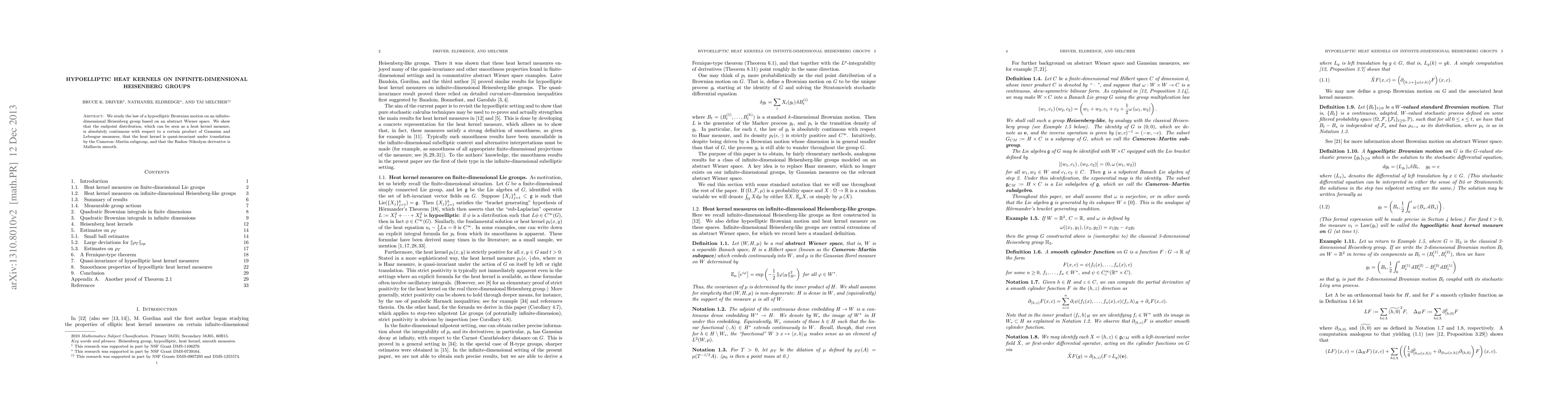 This paper investigates hypoelliptic Brownian motion on infinite-dimensional Heisenberg groups, demonstrating that the associated heat kernel measure is absolutely continuous with respect to a Gaussian-Lebesgue product, and that the heat kernel is quasi-invariant under translation by the Cameron-Martin subgroup, with a Malliavin smooth Radon-Nikodym derivative.