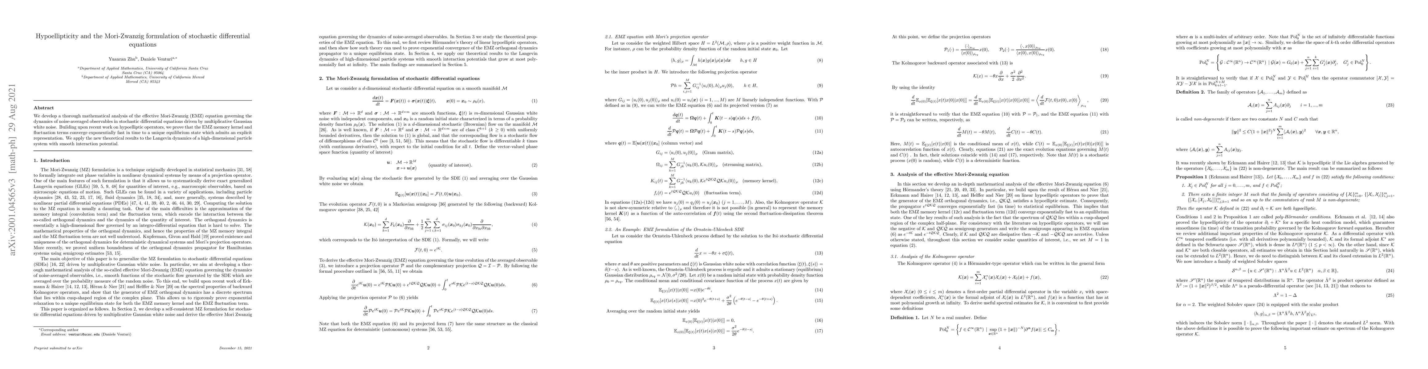 We develop a thorough mathematical analysis of the effective Mori-Zwanzig (EMZ) equation governing the dynamics of noise-averaged observables in stochastic differential equations driven by multiplicative Gaussian white noise. Building upon recent work on hypoelliptic operators, we prove that the EMZ memory kernel and fluctuation terms converge exponentially fast in time to a unique equilibrium state which admits an explicit representation. We apply the new theoretical results to the Langevin dynamics of a high-dimensional particle system with smooth interaction potential.
