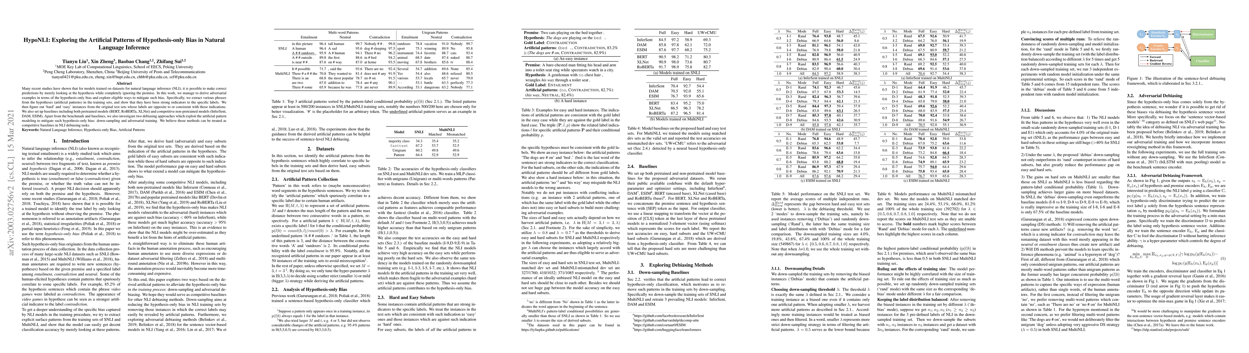 The paper introduces a method for identifying artificial patterns in hypothesis-only sentences and proposes down-sampling and adversarial training as debiasing techniques for NLI models.