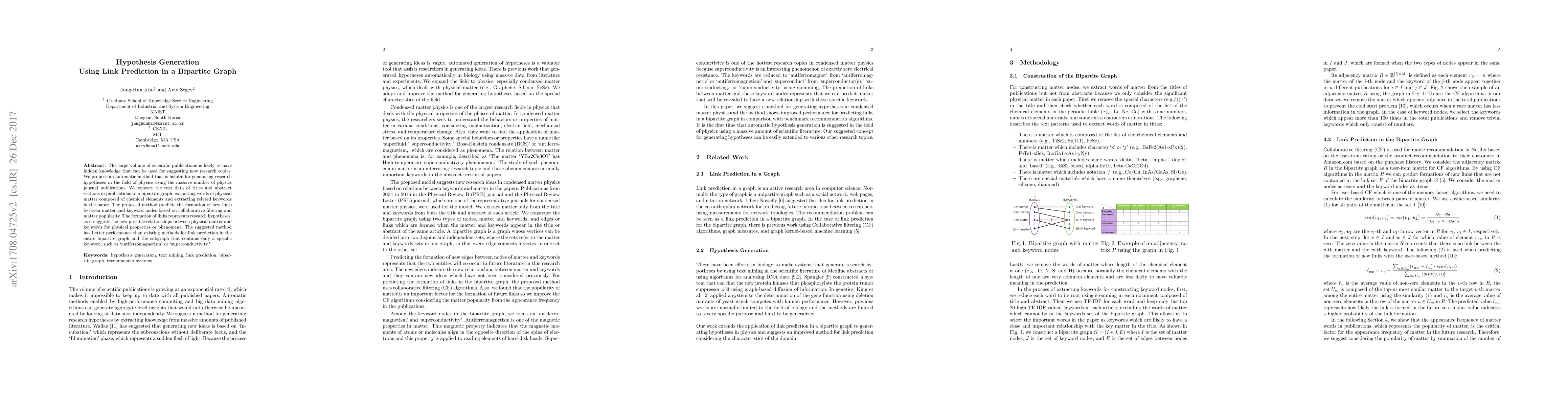 The large volume of scientific publications is likely to have hidden knowledge that can be used for suggesting new research topics. We propose an automatic method that is helpful for generating research hypotheses in the field of physics using the massive number of physics journal publications. We convert the text data of titles and abstract sections in publications to a bipartite graph, extracting words of physical matter composed of chemical elements and extracting related keywords in the paper. The proposed method predicts the formation of new links between matter and keyword nodes based on collaborative filtering and matter popularity. The formation of links represents research hypotheses, as it suggests the new possible relationships between physical matter and keywords for physical properties or phenomena. The suggested method has better performance than existing methods for link prediction in the entire bipartite graph and the subgraph that contains only a specific keyword, such as `antiferromagnetism' or `superconductivity.'
