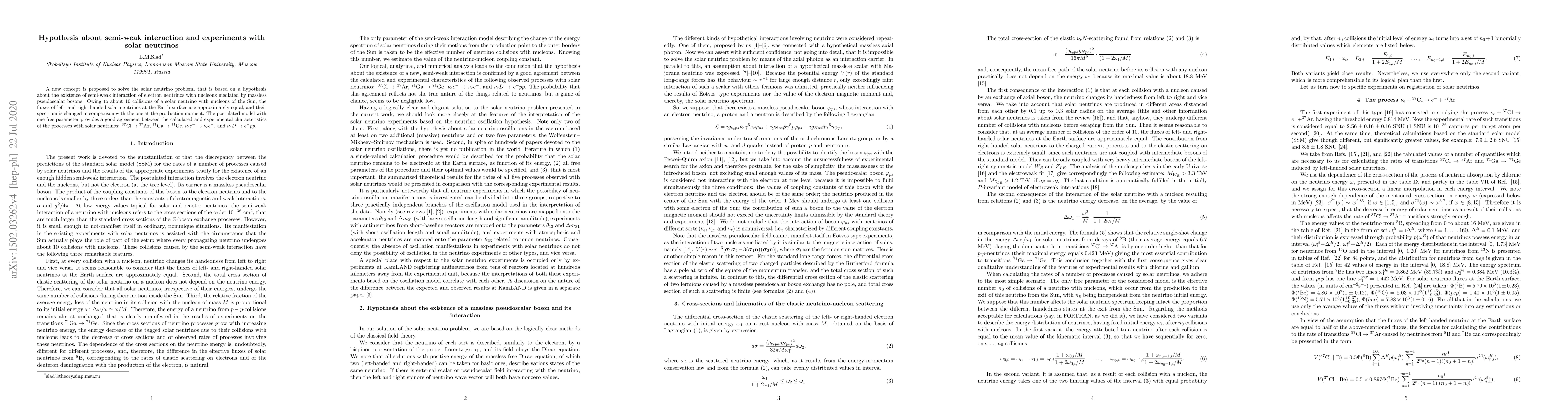 A new concept is proposed to solve the solar neutrino problem, that is based on a hypothesis about the existence of semi-weak interaction of electron neutrinos with nucleons mediated by massless pseudoscalar bosons. Owing to about 10 collisions of a solar neutrino with nucleons of the Sun, the fluxes of left- and right-handed solar neutrinos at the Earth surface are approximately equal, and their spectrum is changed in comparison with the one at the production moment. The postulated model with one free parameter provides a good agreement between the calculated and experimental characteristics of the processes with solar neutrinos: ${}^{37}{\rm Cl} \rightarrow {}^{37}{\rm Ar}$, ${}^{71}{\rm Ga} \rightarrow {}^{71}{\rm Ge}$, $\nu_{e} e^{-}\rightarrow \nu_{e} e^{-}$, and $\nu_{e}D \rightarrow e^{-}pp$.