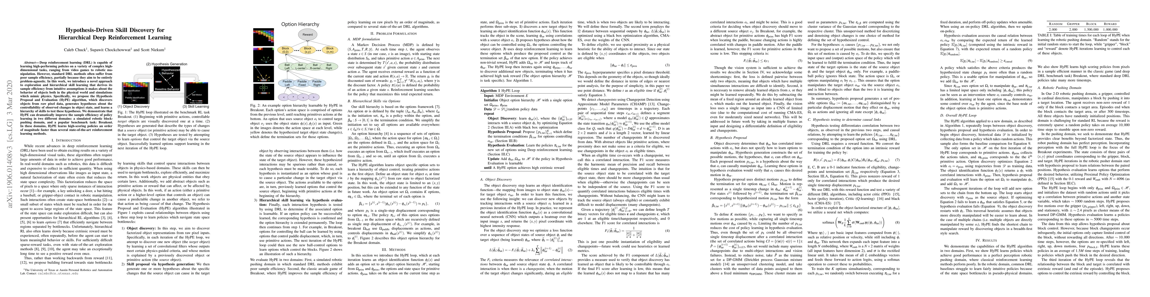 This paper introduces the Hypothesis Proposal and Evaluation (HyPE) algorithm to enhance sample efficiency in hierarchical deep reinforcement learning. HyPE discovers and hypothesizes about object controllability from raw data, learning a hierarchy of skills to test these hypotheses, significantly improving learning speed in simulated robotic and video game tasks.