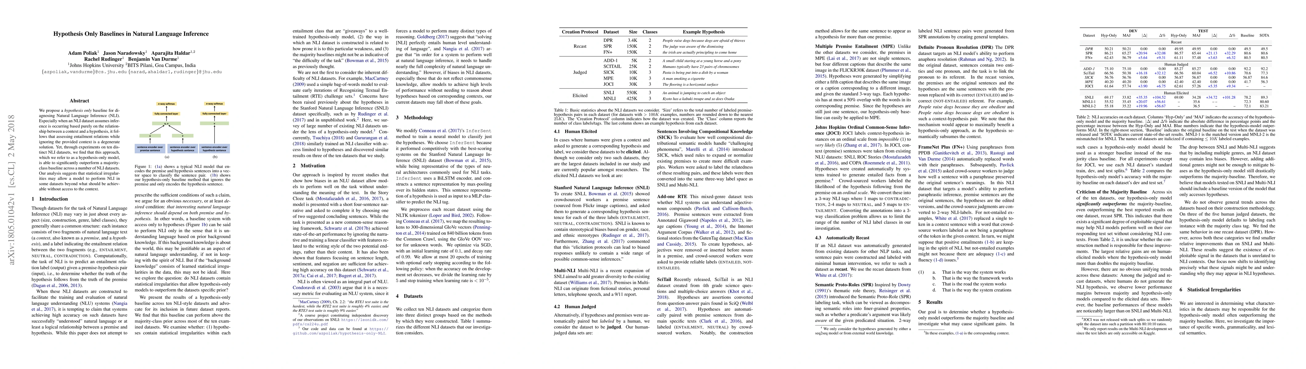 This research introduces a hypothesis-only baseline for Natural Language Inference (NLI) that performs surprisingly well despite ignoring the context, outperforming a majority class baseline on ten datasets. The findings suggest that statistical irregularities may enable this approach to achieve better results than expected without context information.
