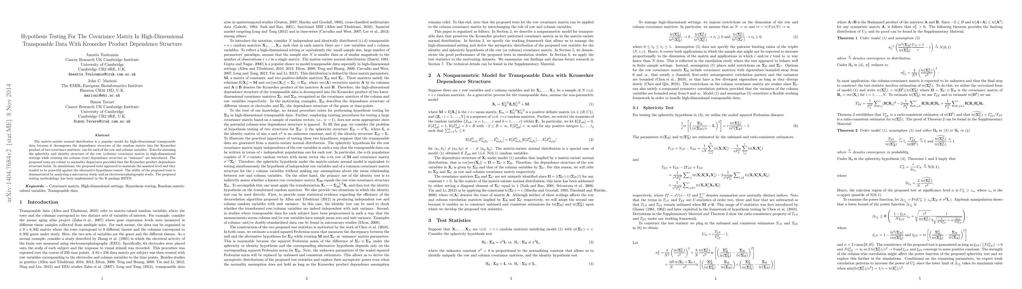 This paper develops tests for assessing the covariance matrix in high-dimensional transposable data with Kronecker product dependence, showing robustness to deviations from normality. The tests maintain nominal levels and are powerful, demonstrated through applications in gene expression and brain activity studies.