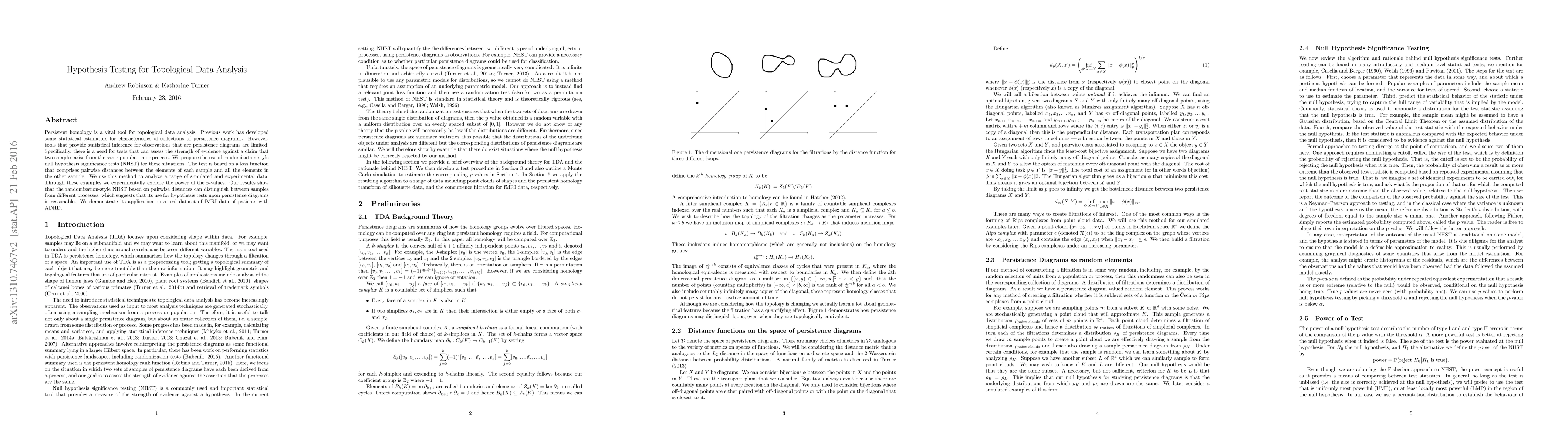 This paper proposes a randomization-style null hypothesis significance test (NHST) for comparing persistence diagrams in topological data analysis, using pairwise distances to assess evidence against a claim of same-population samples. The method's effectiveness is demonstrated through simulations and real fMRI data from ADHD patients, showing its potential for distinguishing different processes.