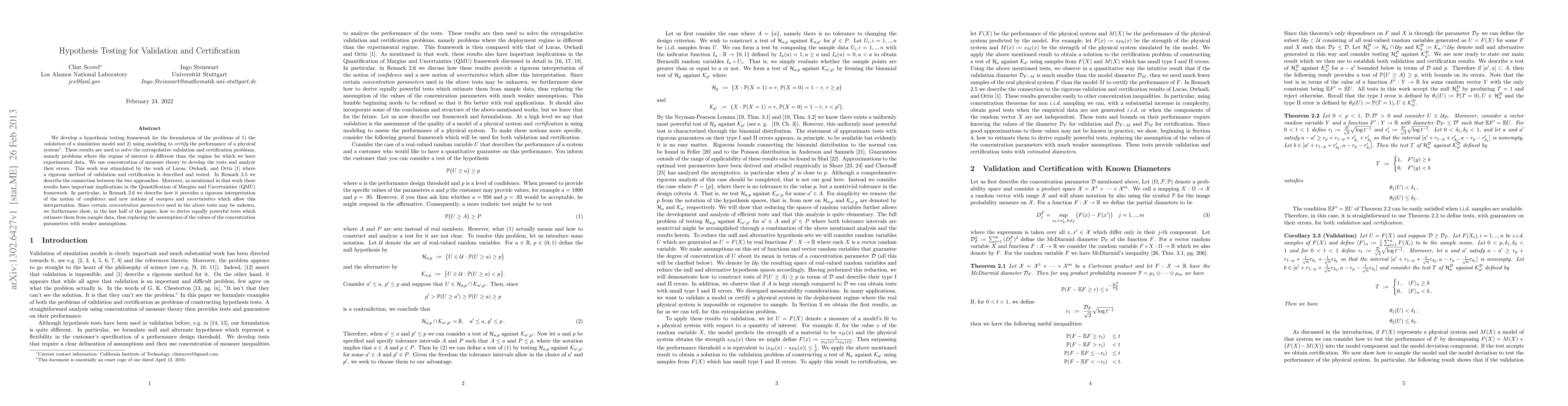 This paper develops a hypothesis testing framework for validating simulation models and certifying physical systems' performance, particularly in extrapolative scenarios. It leverages concentration of measure theory to analyze errors and derive tests that estimate unknown parameters from sample data, providing a rigorous interpretation of confidence and uncertainties.