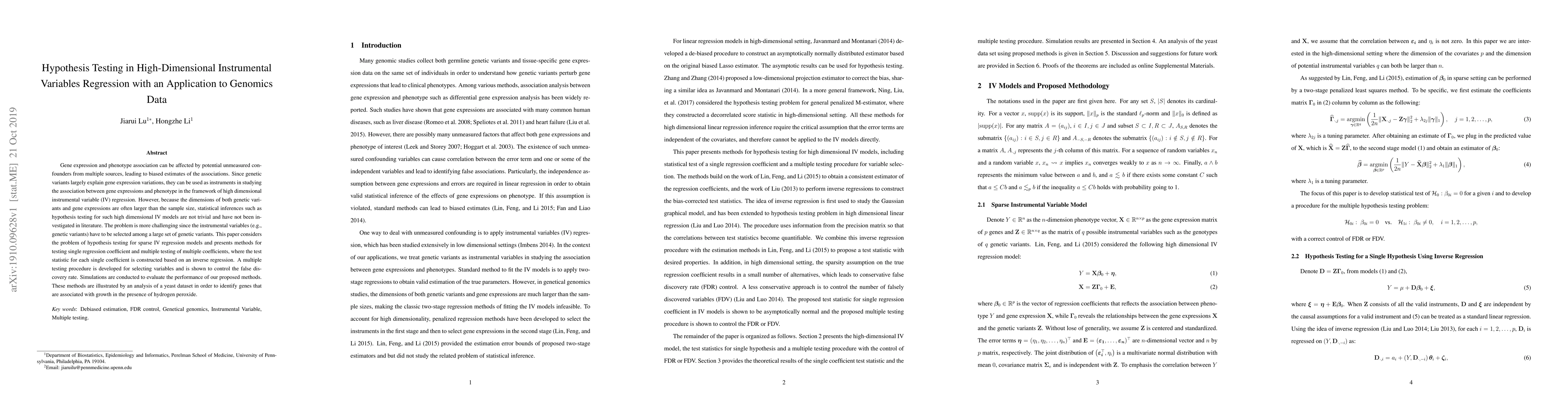 This paper develops methods for hypothesis testing in high-dimensional instrumental variable regression, addressing the challenge of large dimensions relative to sample size. It proposes techniques for testing single and multiple regression coefficients, illustrated through an analysis of a yeast dataset to identify gene expression associations with growth under stress.