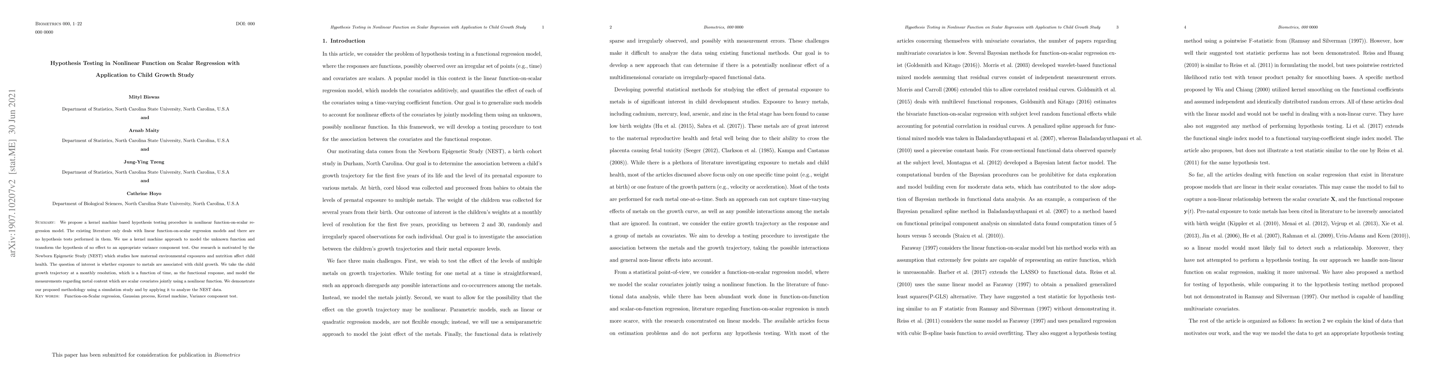 This paper introduces a kernel machine-based hypothesis testing method for nonlinear function-on-scalar regression, applied to the Newborn Epigenetic Study (NEST) to determine if toxic metals or methylation at specific regions are linked to child growth. The method models the unknown function and uses a variance component test to evaluate the hypotheses.