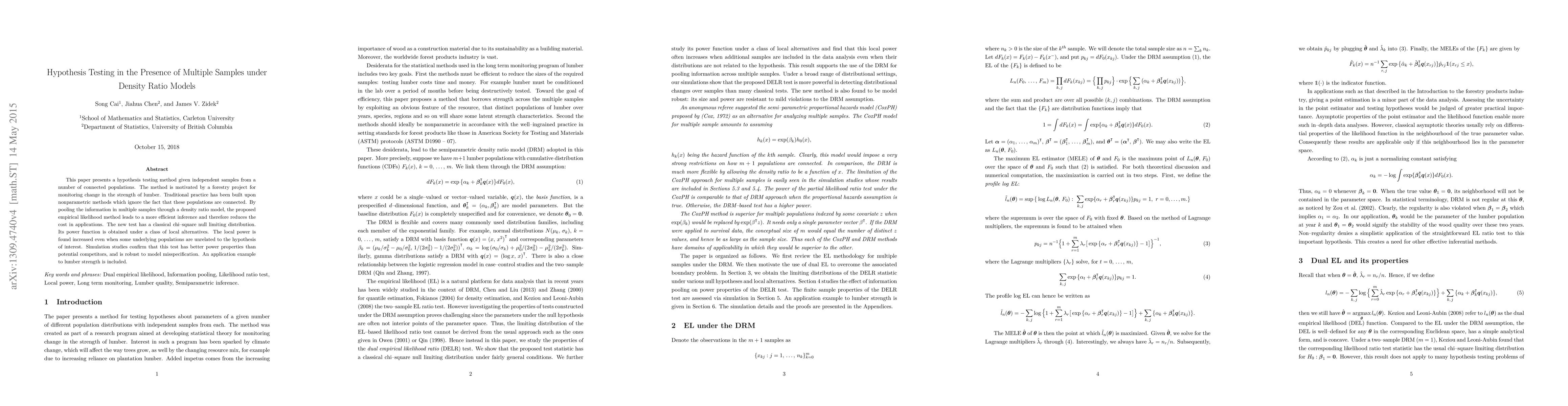 This paper presents a hypothesis testing method given independent samples from a number of connected populations. The method is motivated by a forestry project for monitoring change in the strength of lumber. Traditional practice has been built upon nonparametric methods which ignore the fact that these populations are connected. By pooling the information in multiple samples through a density ratio model, the proposed empirical likelihood method leads to a more efficient inference and therefore reduces the cost in applications. The new test has a classical chi-square null limiting distribution. Its power function is obtained under a class of local alternatives. The local power is found increased even when some underlying populations are unrelated to the hypothesis of interest. Simulation studies confirm that this test has better power properties than potential competitors, and is robust to model misspecification. An application example to lumber strength is included.