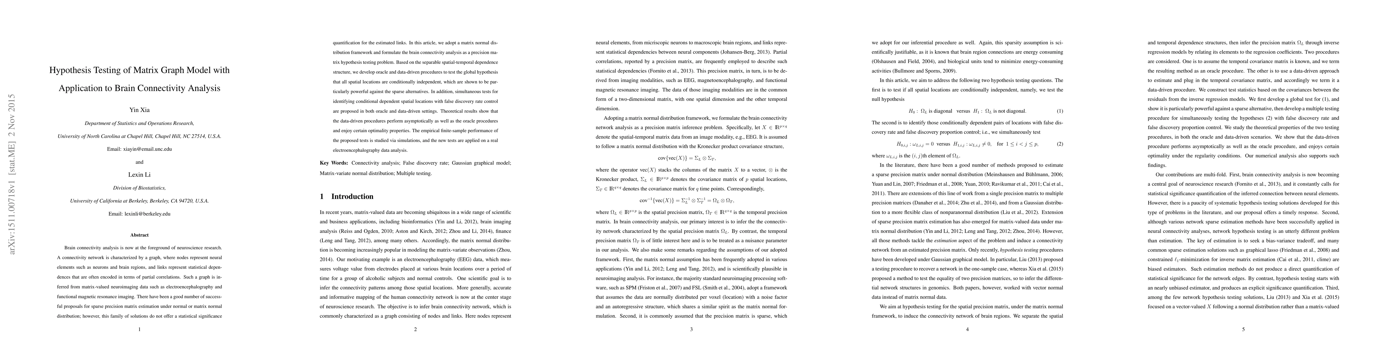 This paper proposes hypothesis testing methods for matrix graph models to analyze brain connectivity, focusing on testing the independence of spatial locations in neural networks using matrix normal distribution. It introduces both oracle and data-driven procedures for global and simultaneous tests, demonstrating their effectiveness through simulations and real EEG data analysis.