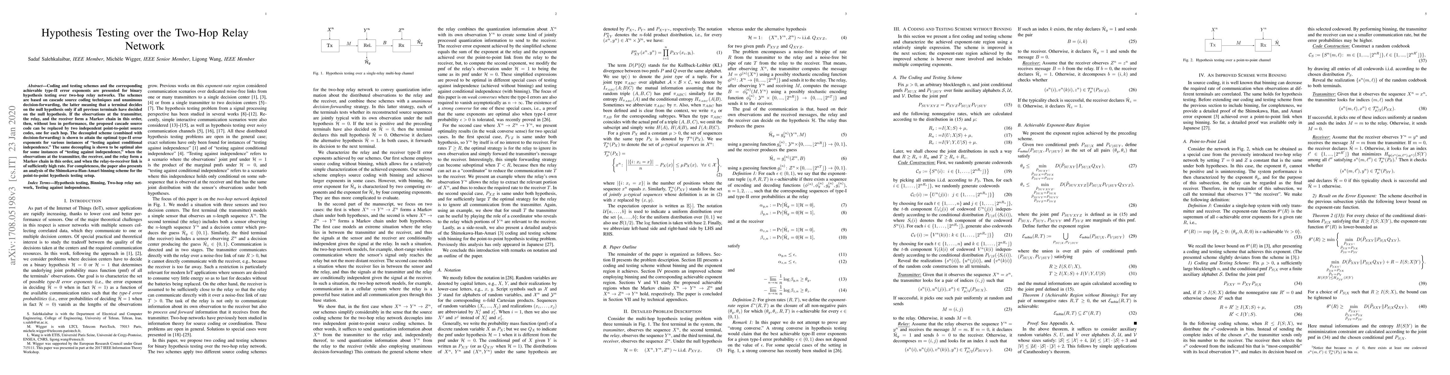 Coding and testing schemes and the corresponding achievable type-II error exponents are presented for binary hypothesis testing over two-hop relay networks. The schemes are based on cascade source coding techniques and {unanimous decision-forwarding}, the latter meaning that a terminal decides on the null hypothesis only if all previous terminals have decided on the null hypothesis. If the observations at the transmitter, the relay, and the receiver form a Markov chain in this order, then, without loss in performance, the proposed cascade source code can be replaced by two independent point-to-point source codes, one for each hop. The decoupled scheme (combined with decision-forwarding) is shown to attain the optimal type-II error exponents for various instances of "testing against conditional independence." The same decoupling is shown to be optimal also for some instances of "testing against independence," when the observations at the transmitter, the receiver, and the relay form a Markov chain in this order, and when the relay-to-receiver link is of sufficiently high rate. For completeness, the paper also presents an analysis of the Shimokawa-Han-Amari binning scheme for the point-to-point hypothesis testing setup.