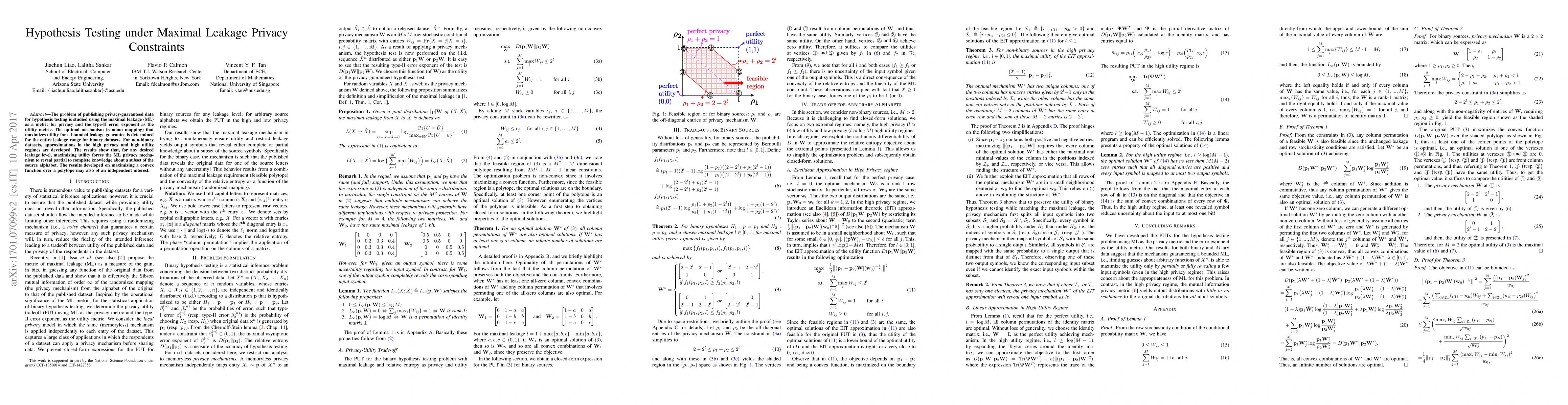 This paper investigates privacy-guaranteed data publication for hypothesis testing under maximal leakage constraints, determining optimal mechanisms for binary datasets and developing approximations for non-binary datasets. It reveals that maximizing utility often requires revealing partial knowledge about a subset of the source alphabet.