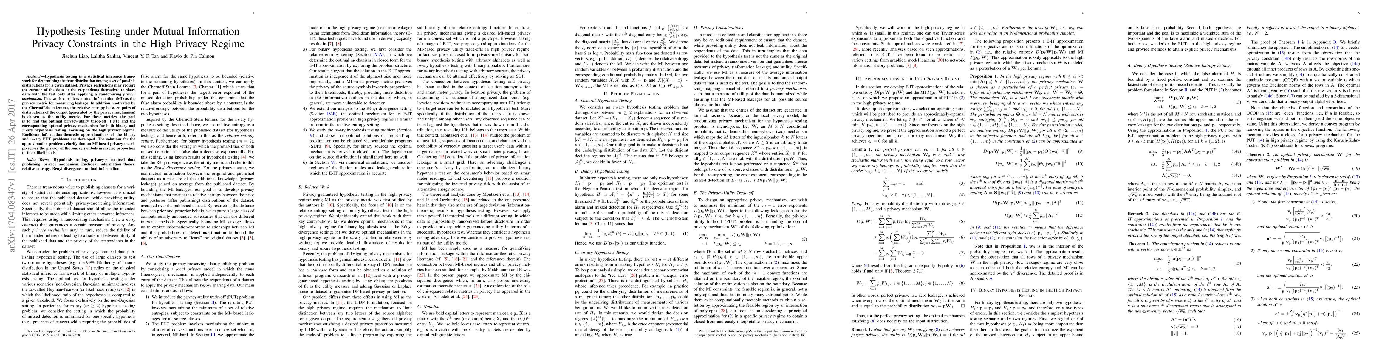 Researchers developed new methods for hypothesis testing under strict privacy constraints using mutual information as a metric for measuring leakage. These methods provide an optimal trade-off between privacy and utility in high-privacy regimes.