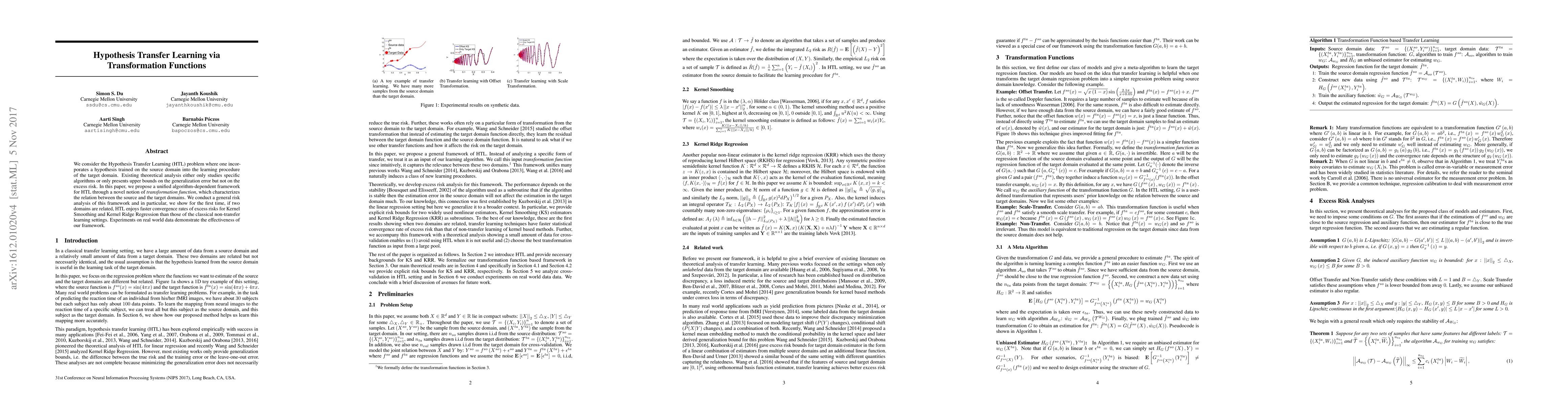 This paper introduces a novel framework for Hypothesis Transfer Learning (HTL) using transformation functions to relate source and target domains, providing a unified algorithm-dependent approach. It demonstrates faster convergence rates for excess risks in Kernel Smoothing and Kernel Ridge Regression compared to non-transfer learning settings, validated by experiments on real-world data.