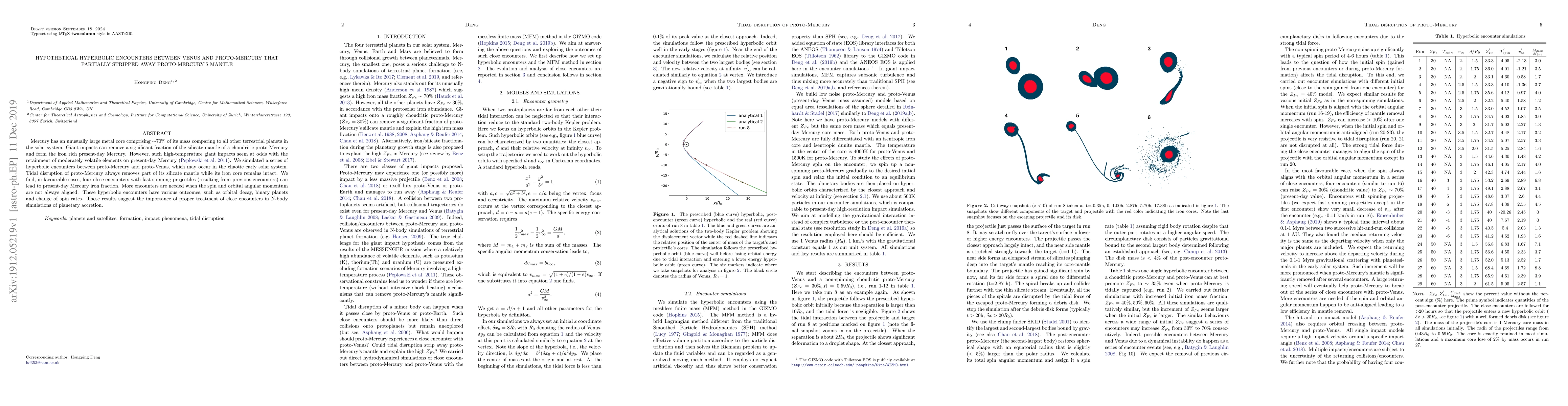 This paper explores hypothetical hyperbolic encounters between proto-Venus and proto-Mercury, demonstrating that such interactions can strip away part of Mercury's mantle while preserving its iron core, potentially explaining Mercury's large metal core. The study highlights the significance of considering these encounters in planetary accretion models.
