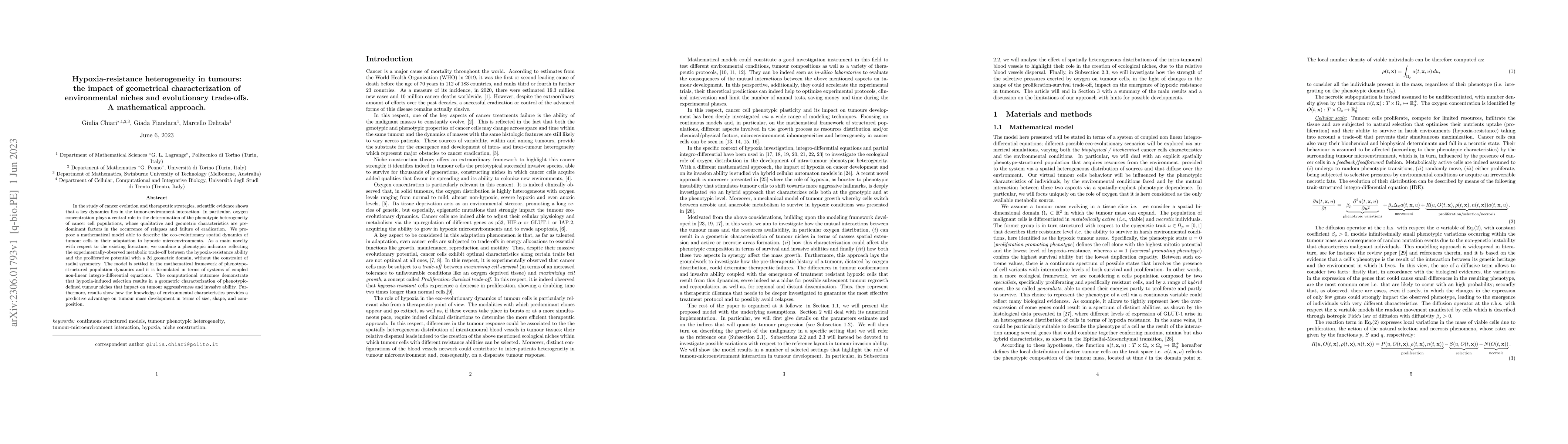 In the study of cancer evolution and therapeutic strategies, scientific evidence shows that a key dynamics lies in the tumor-environment interaction. In particular, oxygen concentration plays a central role in the determination of the phenotypic heterogeneity of cancer cell populations, whose qualitative and geometric characteristics are predominant factors in the occurrence of relapses and failure of eradication. We propose a mathematical model able to describe the eco-evolutionary spatial dynamics of tumour cells in their adaptation to hypoxic microenvironments. As a main novelty with respect to the existing literature, we combine a phenotypic indicator reflecting the experimentally-observed metabolic trade-off between the hypoxia-resistance ability and the proliferative potential with a 2d geometric domain, without the constraint of radial symmetry. The model is settled in the mathematical framework of phenotype-structured population dynamics and it is formulated in terms of systems of coupled non-linear integro-differential equations. The computational outcomes demonstrate that hypoxia-induced selection results in a geometric characterization of phenotypic-defined tumour niches that impact on tumour aggressiveness and invasive ability. Furthermore, results show how the knowledge of environmental characteristics provides a predictive advantage on tumour mass development in terms of size, shape, and composition.