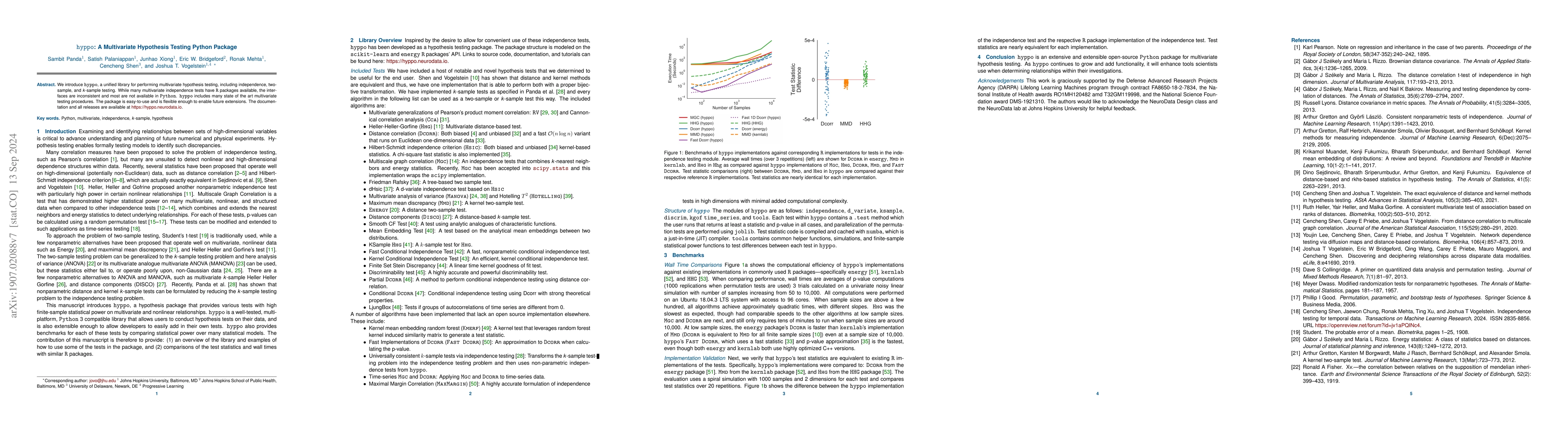 The hyppo package provides a unified Python library for multivariate hypothesis testing, including independence, two-sample, and k-sample tests, addressing the lack of consistent interfaces in existing Python alternatives. It is user-friendly and flexible for future extensions.