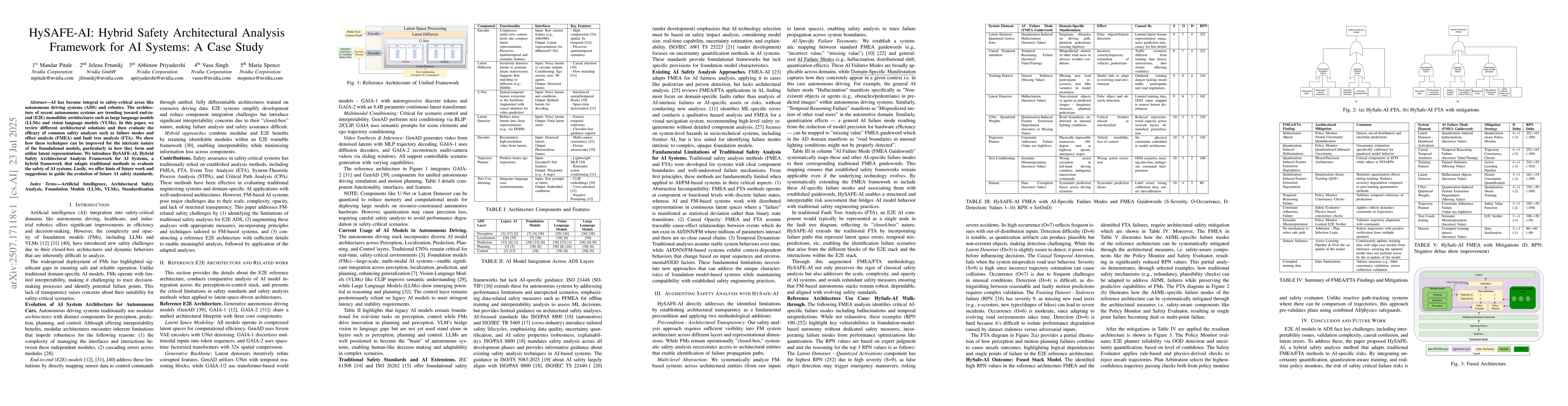 AI has become integral to safety-critical areas like autonomous driving systems (ADS) and robotics. The architecture of recent autonomous systems are trending toward end-to-end (E2E) monolithic architectures such as large language models (LLMs) and vision language models (VLMs). In this paper, we review different architectural solutions and then evaluate the efficacy of common safety analyses such as failure modes and effect analysis (FMEA) and fault tree analysis (FTA). We show how these techniques can be improved for the intricate nature of the foundational models, particularly in how they form and utilize latent representations. We introduce HySAFE-AI, Hybrid Safety Architectural Analysis Framework for AI Systems, a hybrid framework that adapts traditional methods to evaluate the safety of AI systems. Lastly, we offer hints of future work and suggestions to guide the evolution of future AI safety standards.