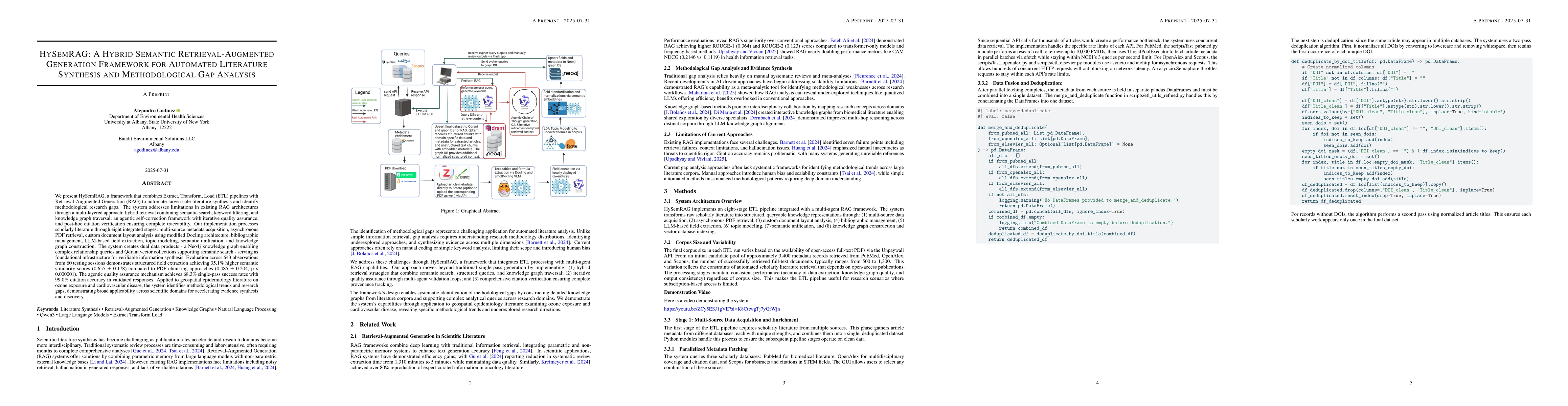We present HySemRAG, a framework that combines Extract, Transform, Load (ETL) pipelines with Retrieval-Augmented Generation (RAG) to automate large-scale literature synthesis and identify methodological research gaps. The system addresses limitations in existing RAG architectures through a multi-layered approach: hybrid retrieval combining semantic search, keyword filtering, and knowledge graph traversal; an agentic self-correction framework with iterative quality assurance; and post-hoc citation verification ensuring complete traceability. Our implementation processes scholarly literature through eight integrated stages: multi-source metadata acquisition, asynchronous PDF retrieval, custom document layout analysis using modified Docling architecture, bibliographic management, LLM-based field extraction, topic modeling, semantic unification, and knowledge graph construction. The system creates dual data products - a Neo4j knowledge graph enabling complex relationship queries and Qdrant vector collections supporting semantic search - serving as foundational infrastructure for verifiable information synthesis. Evaluation across 643 observations from 60 testing sessions demonstrates structured field extraction achieving 35.1% higher semantic similarity scores (0.655 $\pm$ 0.178) compared to PDF chunking approaches (0.485 $\pm$ 0.204, p < 0.000001). The agentic quality assurance mechanism achieves 68.3% single-pass success rates with 99.0% citation accuracy in validated responses. Applied to geospatial epidemiology literature on ozone exposure and cardiovascular disease, the system identifies methodological trends and research gaps, demonstrating broad applicability across scientific domains for accelerating evidence synthesis and discovery.
